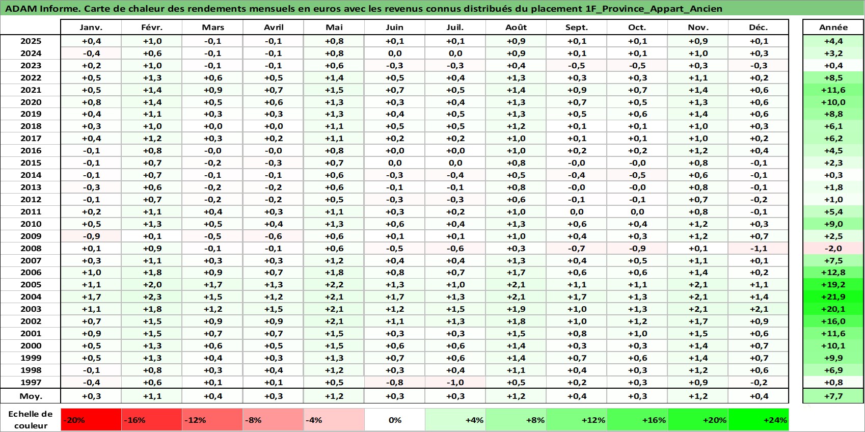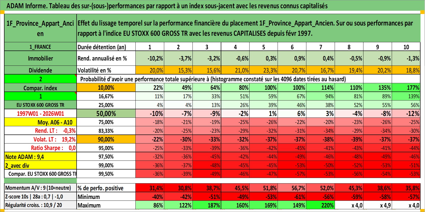 Site dédié aux investisseursPage dédiée sur site financeAnalyse des valorisations hebdomadaires de l'actif 1F_Province_Appart_Ancien. Cet actif est cote en EUR. Les valorisations couvrent les semaines 1997W01 a 2026W01. Les loyers de cet actif immobilier sont pris egaux a 3,33% annuels de la valeur venale du logement.