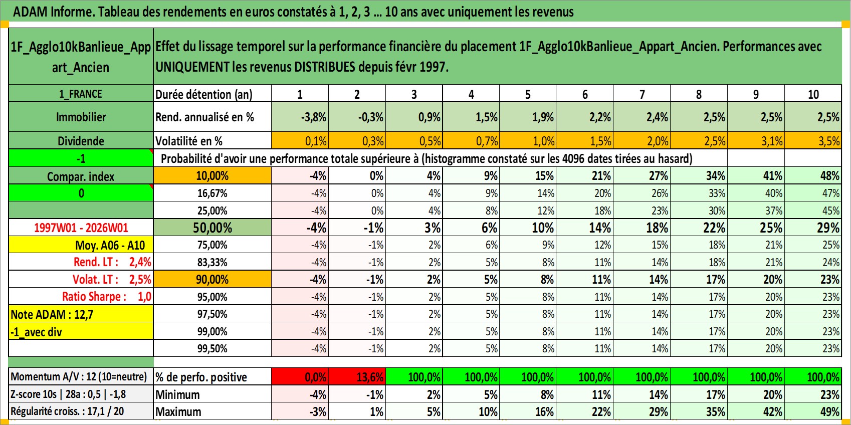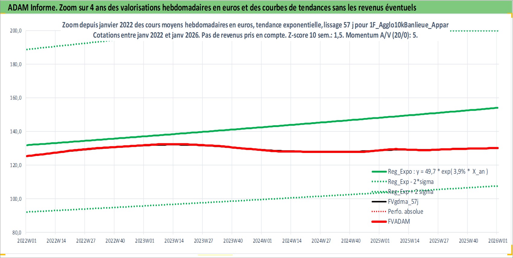 Site dédié aux investisseursPage dédiée sur site financeAnalyse des valorisations hebdomadaires de l'actif 1F_Agglo10kBanlieue_Appart_Ancien. Cet actif est cote en EUR. Les valorisations couvrent les semaines 1997W01 a 2026W01. Les loyers de cet actif immobilier sont pris egaux a 3,33% annuels de la valeur venale du logement.