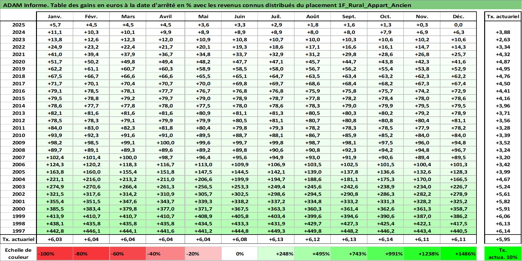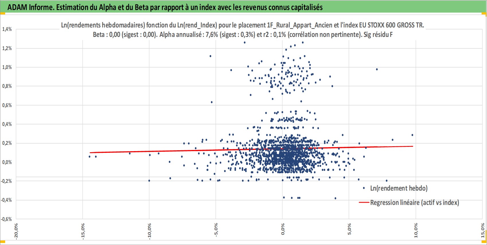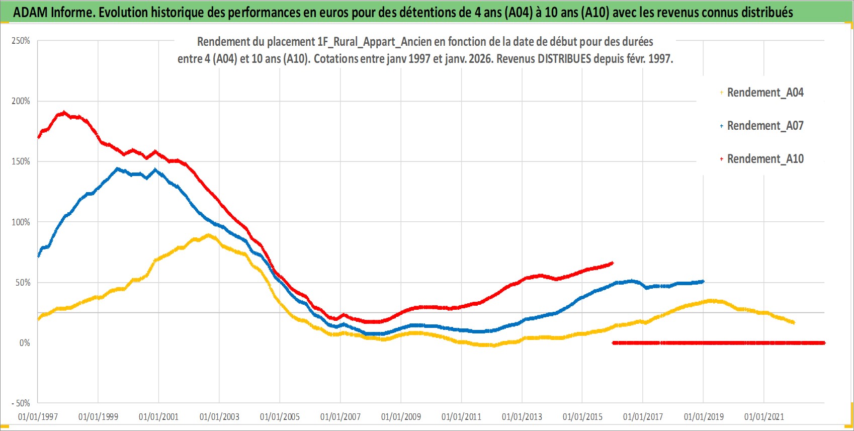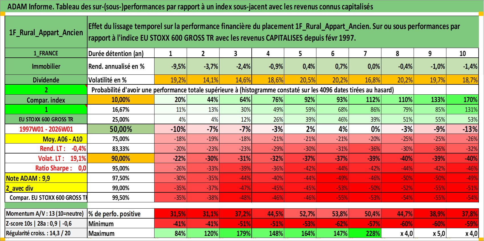 Site dédié aux investisseursPage dédiée sur site financeAnalyse des valorisations hebdomadaires de l'actif 1F_Rural_Appart_Ancien. Cet actif est cote en EUR. Les valorisations couvrent les semaines 1997W01 a 2026W01. Les loyers de cet actif immobilier sont pris egaux a 3,33% annuels de la valeur venale du logement.