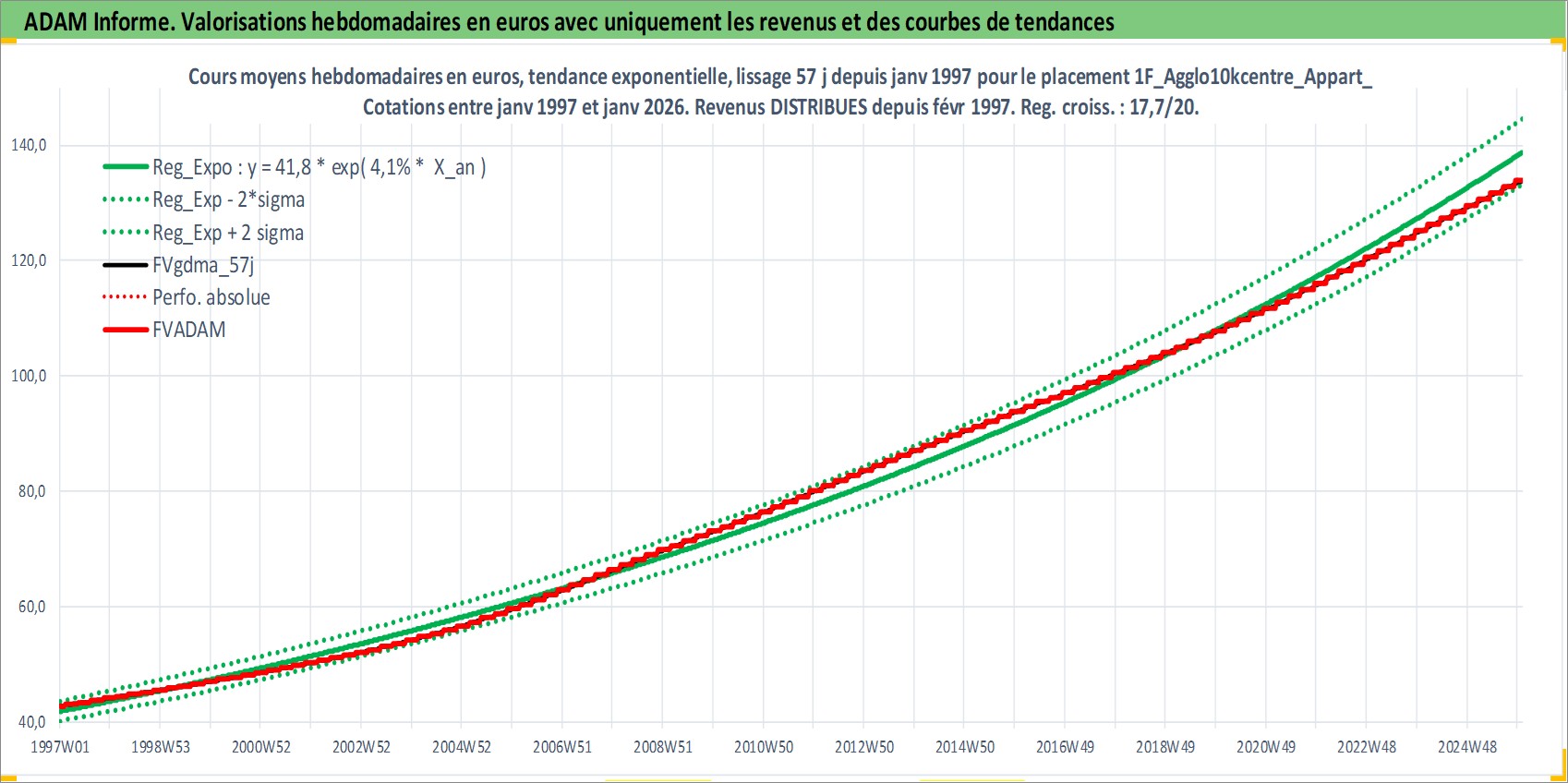 Site dédié aux investisseursPage dédiée sur site financeAnalyse des valorisations hebdomadaires de l'actif 1F_Agglo10kcentre_Appart_Ancien. Cet actif est cote en EUR. Les valorisations couvrent les semaines 1997W01 a 2026W01. Les loyers de cet actif immobilier sont pris egaux a 3,33% annuels de la valeur venale du logement.