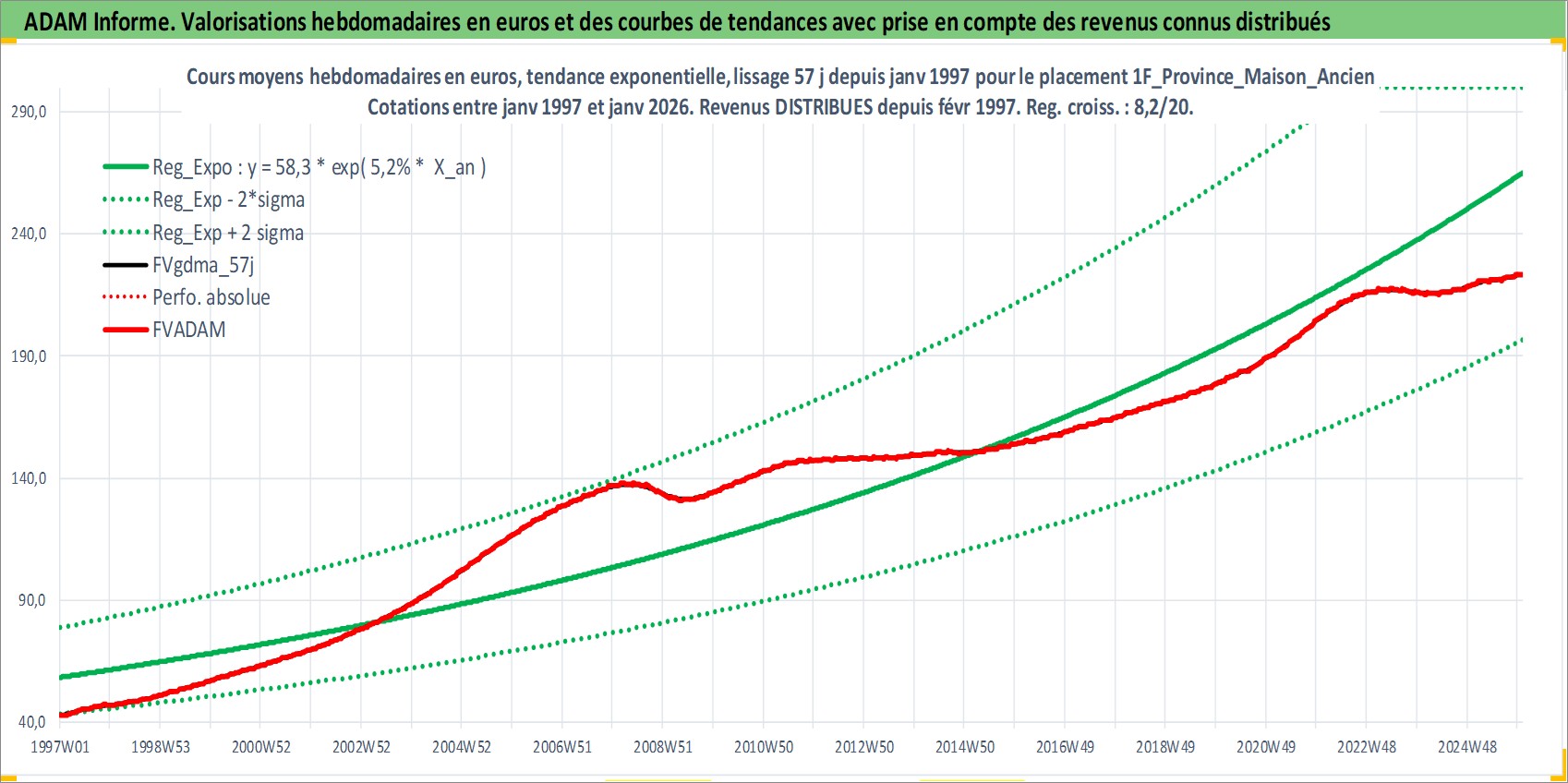 Site dédié aux investisseursPage dédiée sur site financeAnalyse des valorisations hebdomadaires de l'actif 1F_Province_Maison_Ancien. Cet actif est cote en EUR. Les valorisations couvrent les semaines 1997W01 a 2026W01. Les loyers de cet actif immobilier sont pris egaux a 3,33% annuels de la valeur venale du logement.