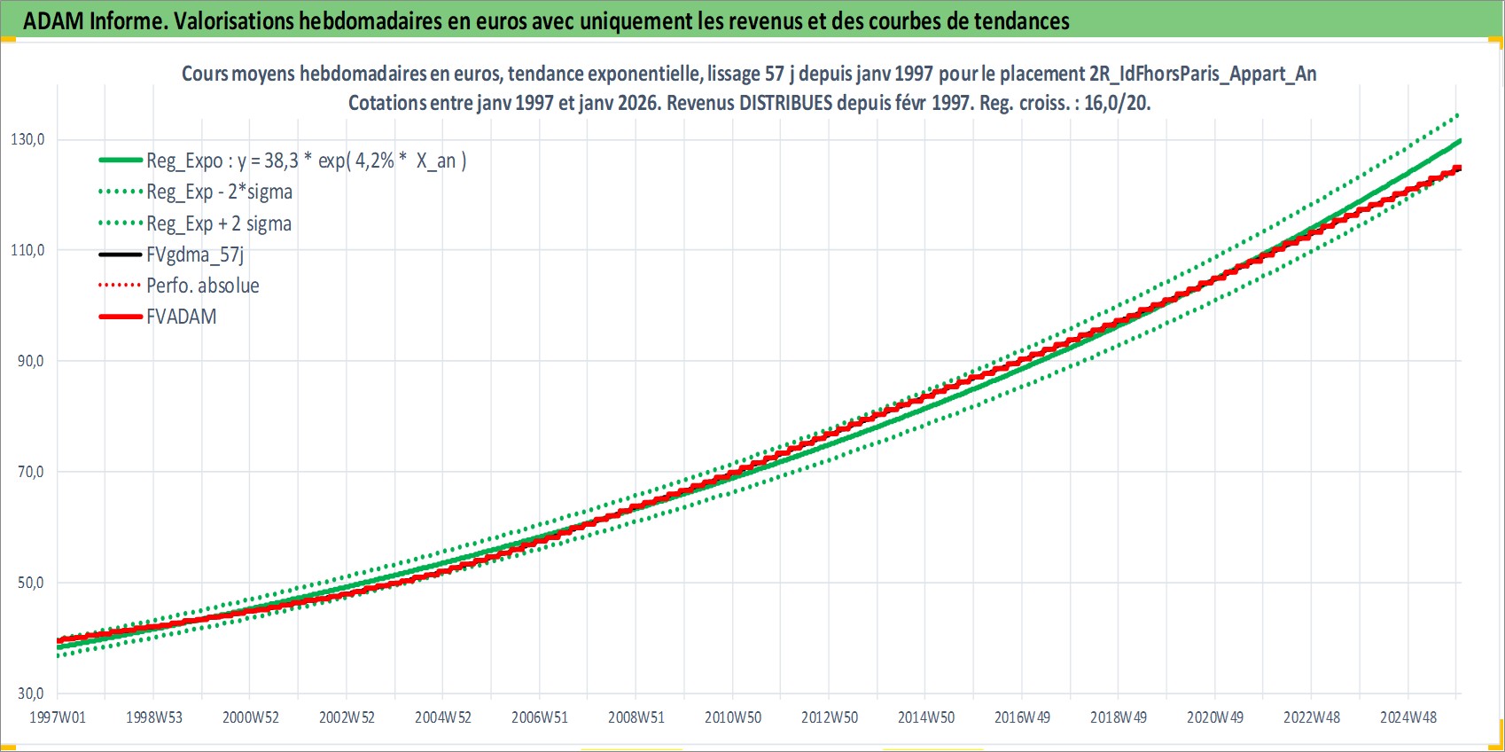 Site dédié aux investisseursPage dédiée sur site financeAnalyse des valorisations hebdomadaires de l'actif 2R_IdFhorsParis_Appart_Ancien. Cet actif est cote en EUR. Les valorisations couvrent les semaines 1997W01 a 2026W01. Les loyers de cet actif immobilier sont pris egaux a 3,33% annuels de la valeur venale du logement.