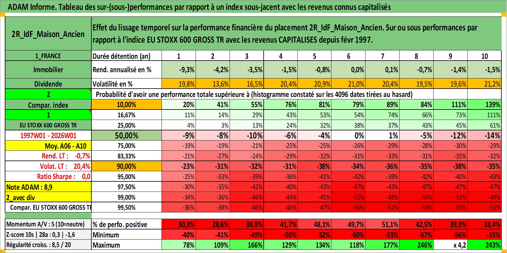 Site dédié aux investisseursPage dédiée sur site financeAnalyse des valorisations hebdomadaires de l'actif 2R_IdF_Maison_Ancien. Cet actif est cote en EUR. Les valorisations couvrent les semaines 1997W01 a 2026W01. Les loyers de cet actif immobilier sont pris egaux a 3,33% annuels de la valeur venale du logement.