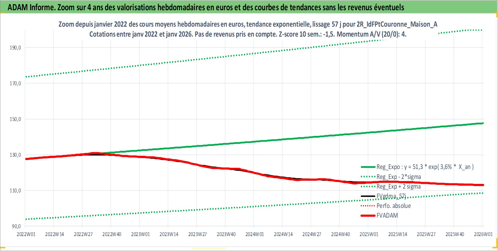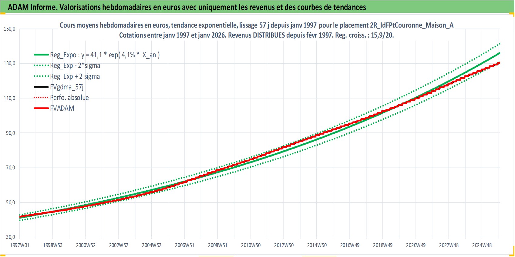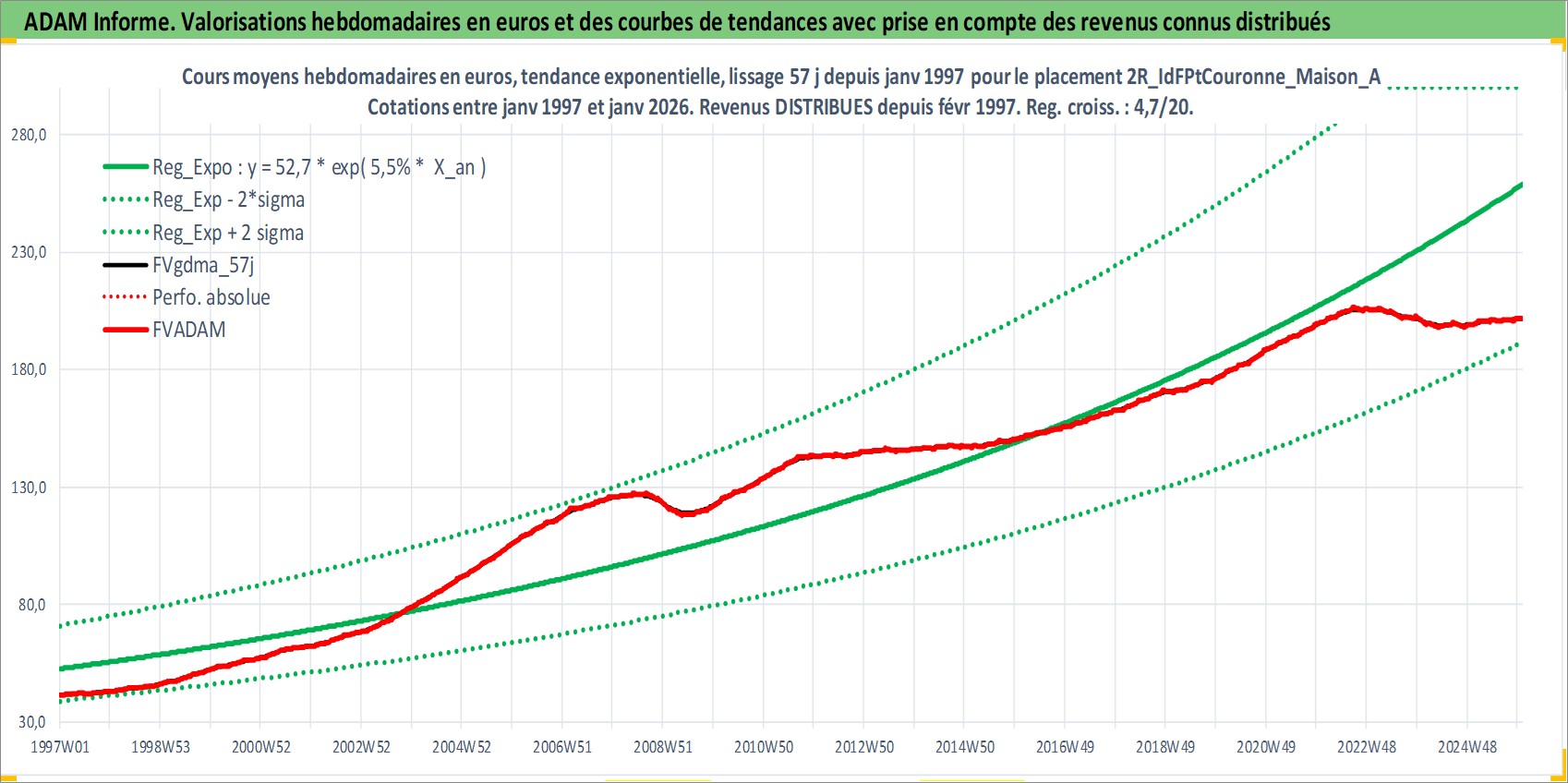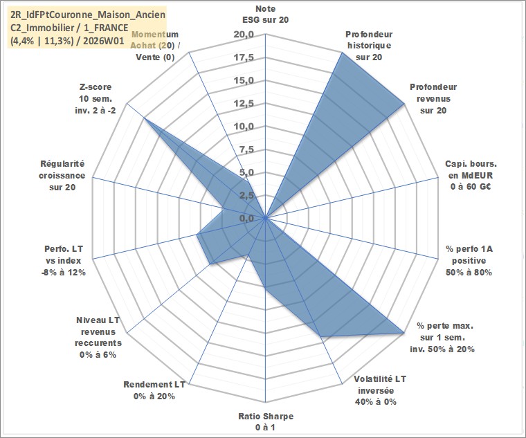 Site dédié aux investisseursPage dédiée sur site financeAnalyse des valorisations hebdomadaires de l'actif 2R_IdFPtCouronne_Maison_Ancien. Cet actif est cote en EUR. Les valorisations couvrent les semaines 1997W01 a 2026W01. Les loyers de cet actif immobilier sont pris egaux a 3,33% annuels de la valeur venale du logement.