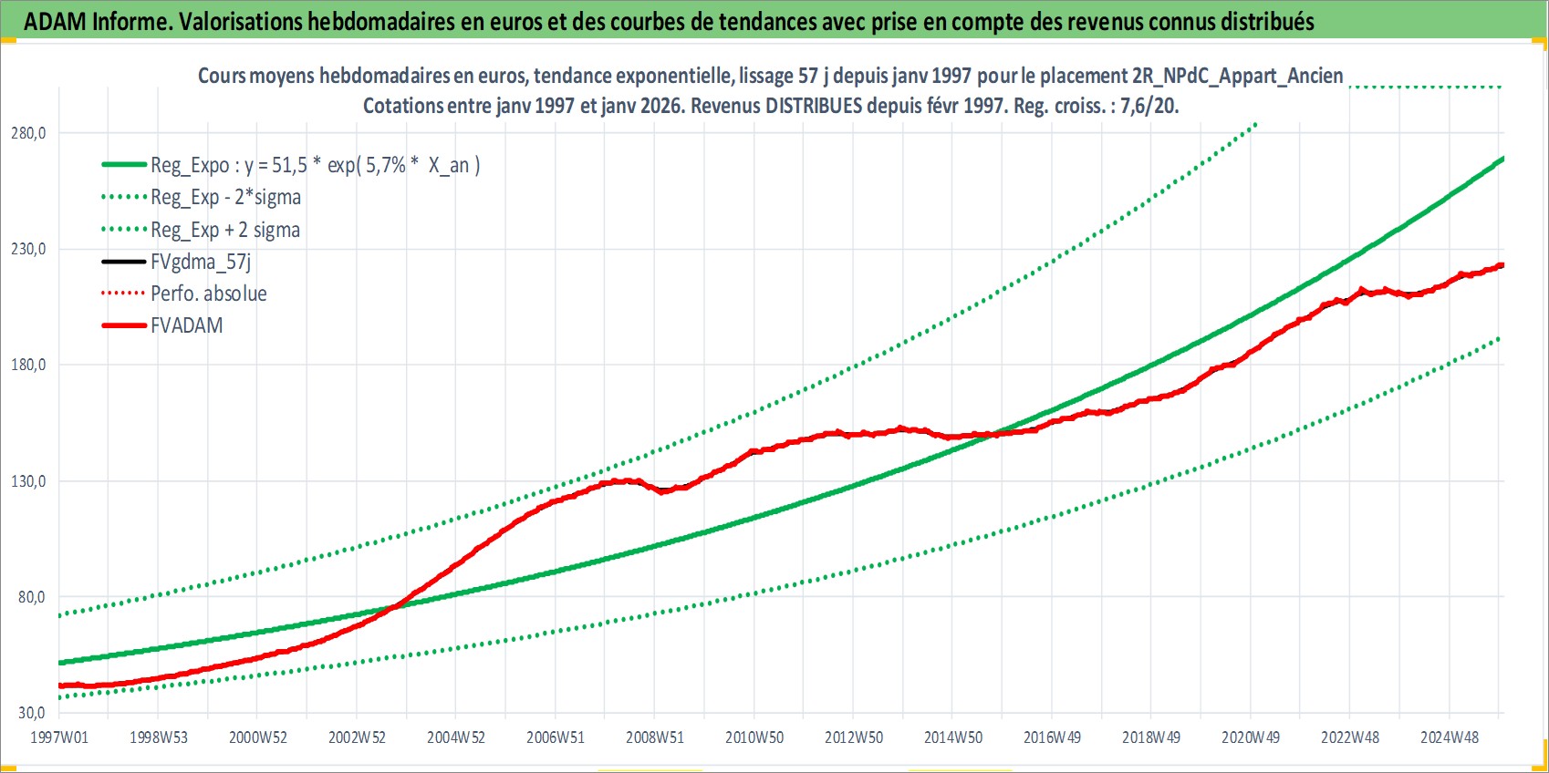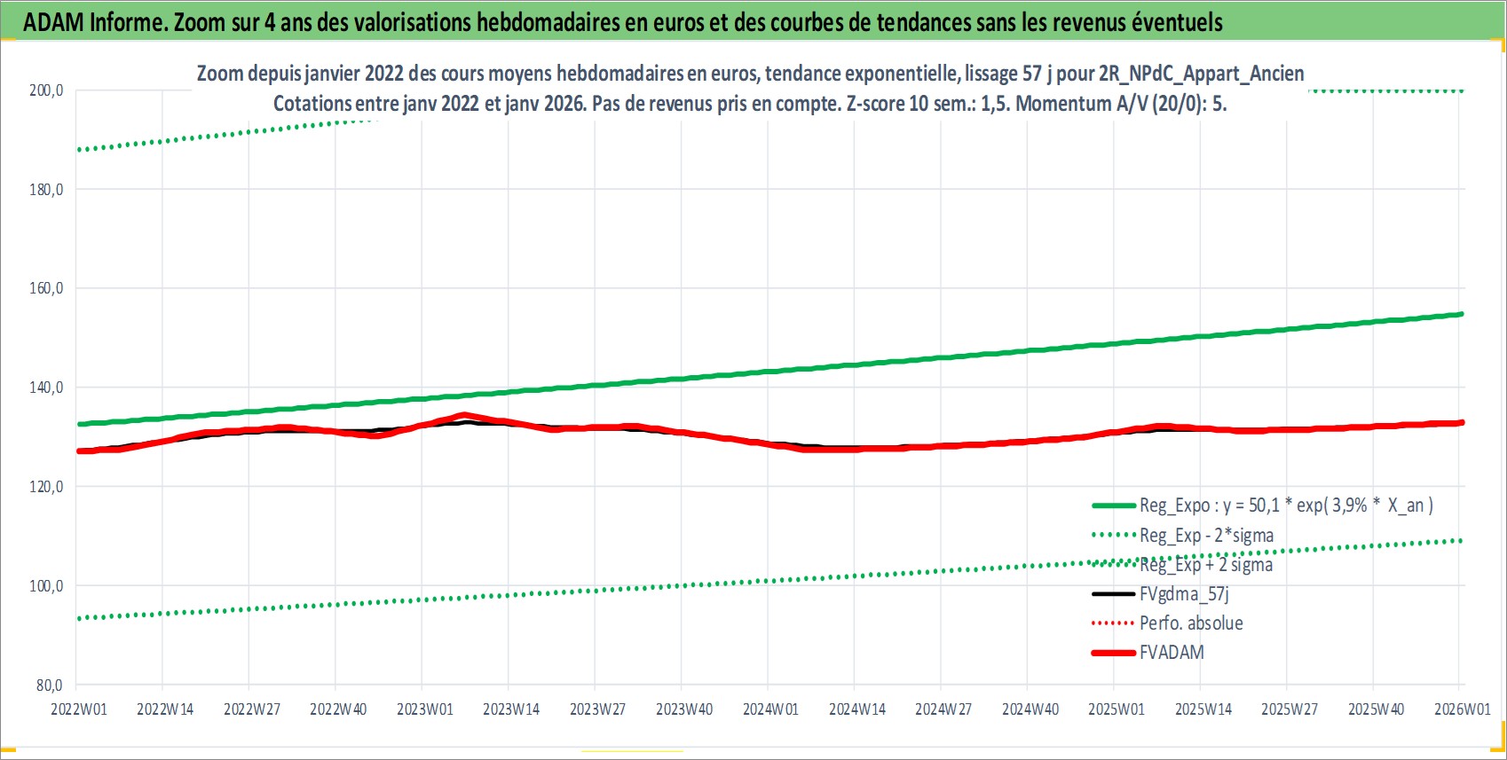 Site dédié aux investisseursPage dédiée sur site financeAnalyse des valorisations hebdomadaires de l'actif 2R_NPdC_Appart_Ancien. Cet actif est cote en EUR. Les valorisations couvrent les semaines 1997W01 a 2026W01. Les loyers de cet actif immobilier sont pris egaux a 3,33% annuels de la valeur venale du logement.