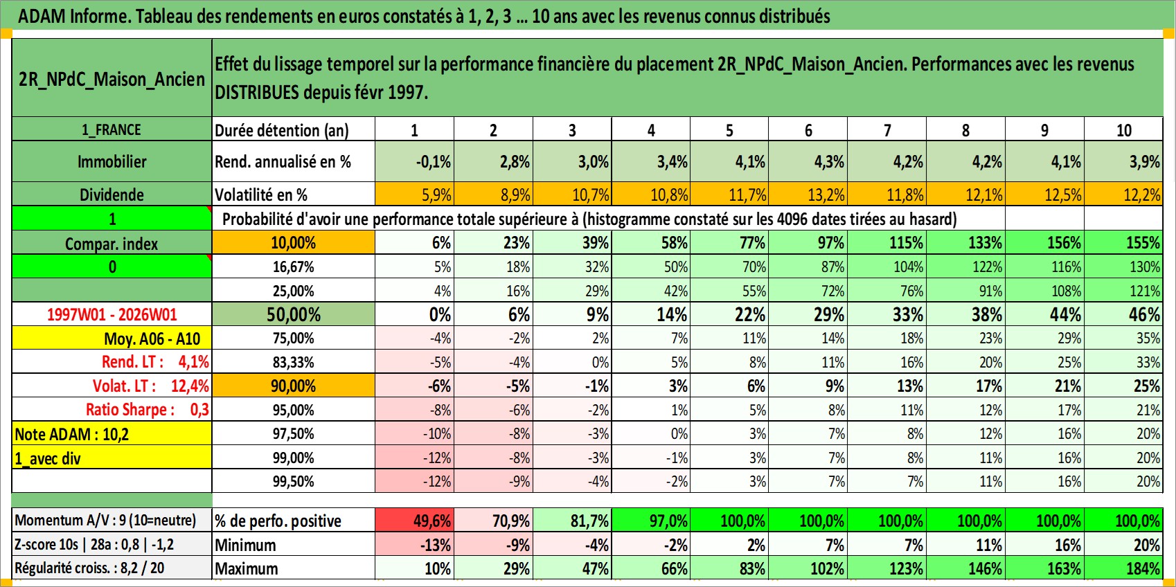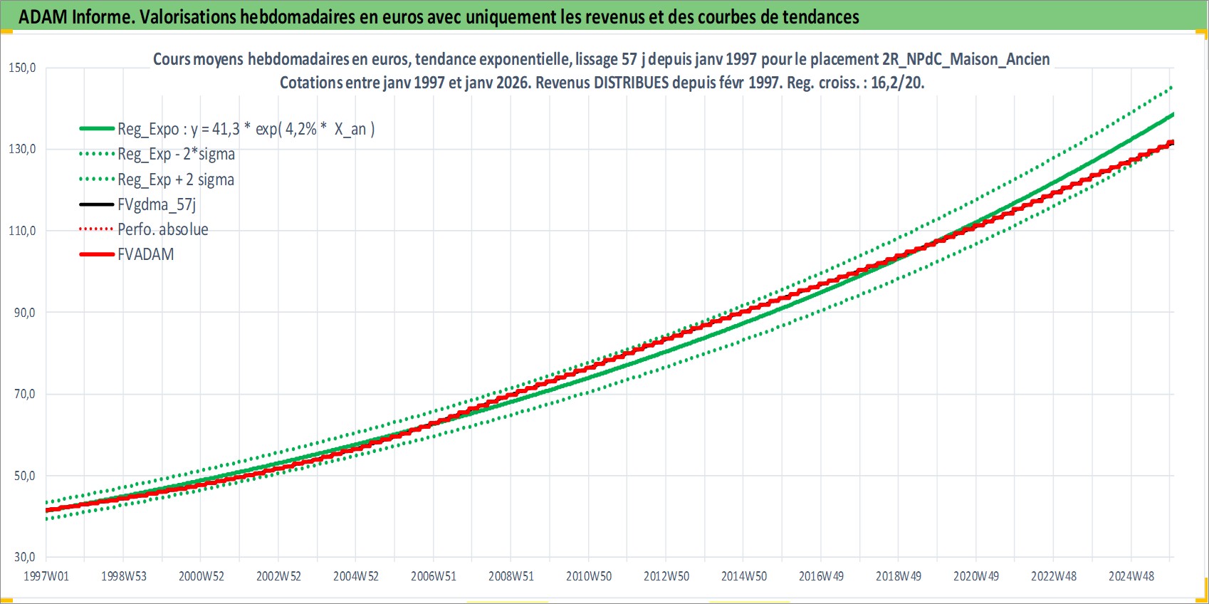 Site dédié aux investisseursPage dédiée sur site financeAnalyse des valorisations hebdomadaires de l'actif 2R_NPdC_Maison_Ancien. Cet actif est cote en EUR. Les valorisations couvrent les semaines 1997W01 a 2026W01. Les loyers de cet actif immobilier sont pris egaux a 3,33% annuels de la valeur venale du logement.