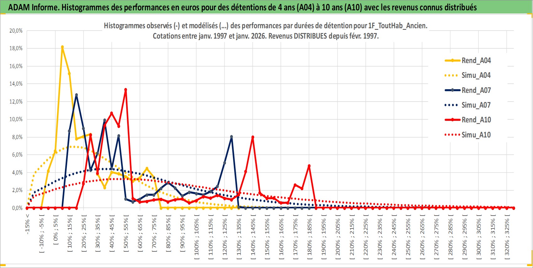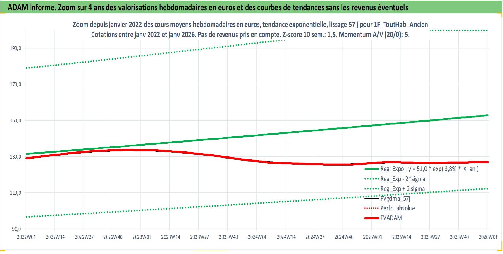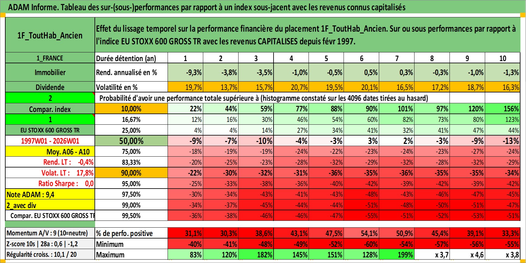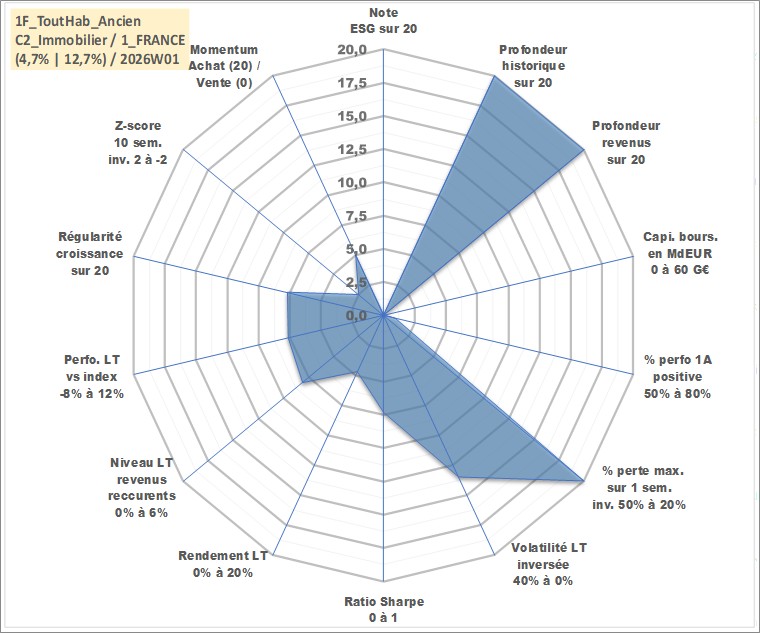 Site dédié aux investisseursPage dédiée sur site financeAnalyse des valorisations hebdomadaires de l'actif 1F_ToutHab_Ancien. Cet actif est cote en EUR. Les valorisations couvrent les semaines 1997W01 a 2026W01. Les loyers de cet actif immobilier sont pris egaux a 3,33% annuels de la valeur venale du logement.