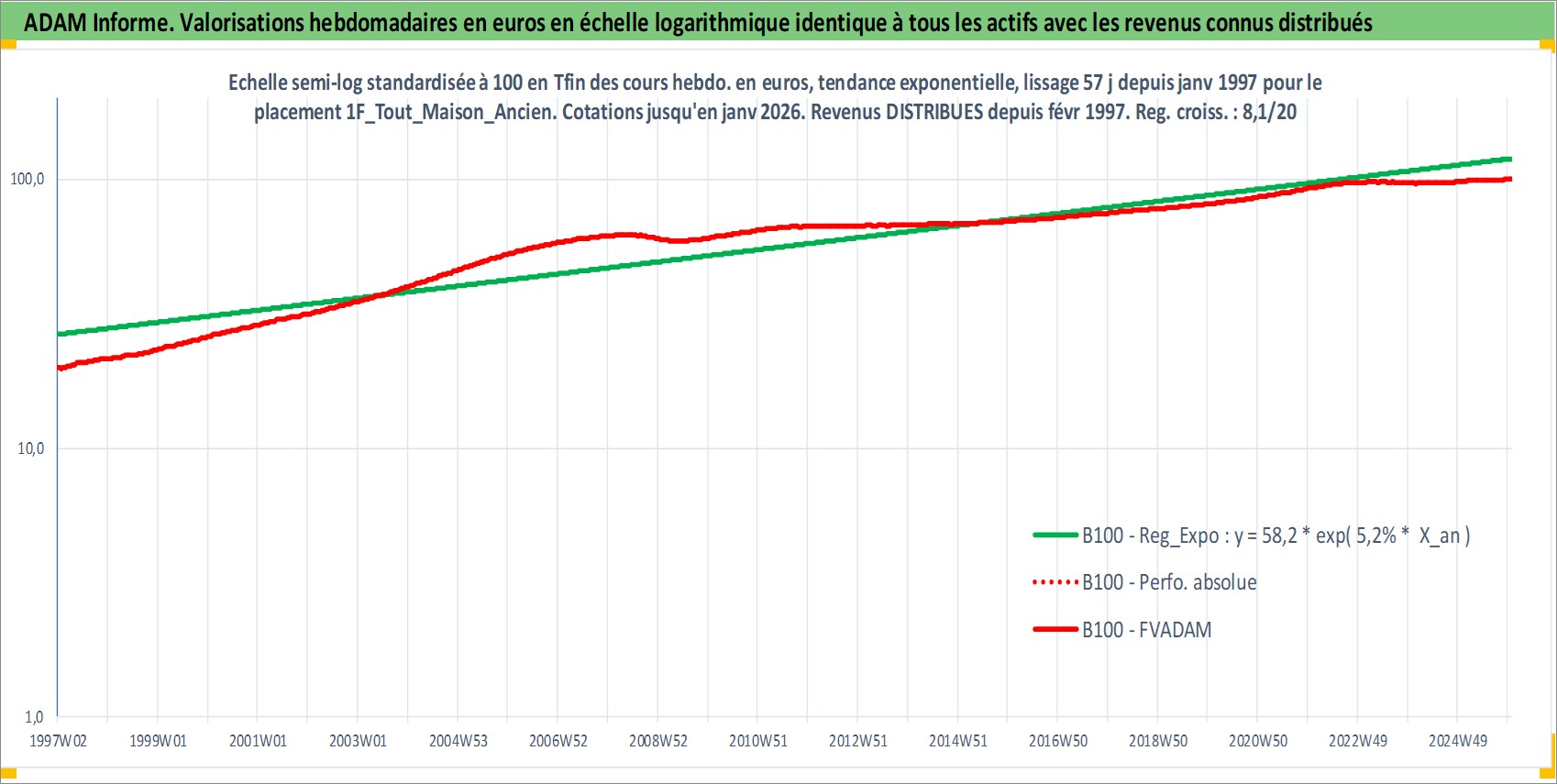 Site dédié aux investisseursPage dédiée sur site financeAnalyse des valorisations hebdomadaires de l'actif 1F_Tout_Maison_Ancien. Cet actif est cote en EUR. Les valorisations couvrent les semaines 1997W01 a 2026W01. Les loyers de cet actif immobilier sont pris egaux a 3,33% annuels de la valeur venale du logement.