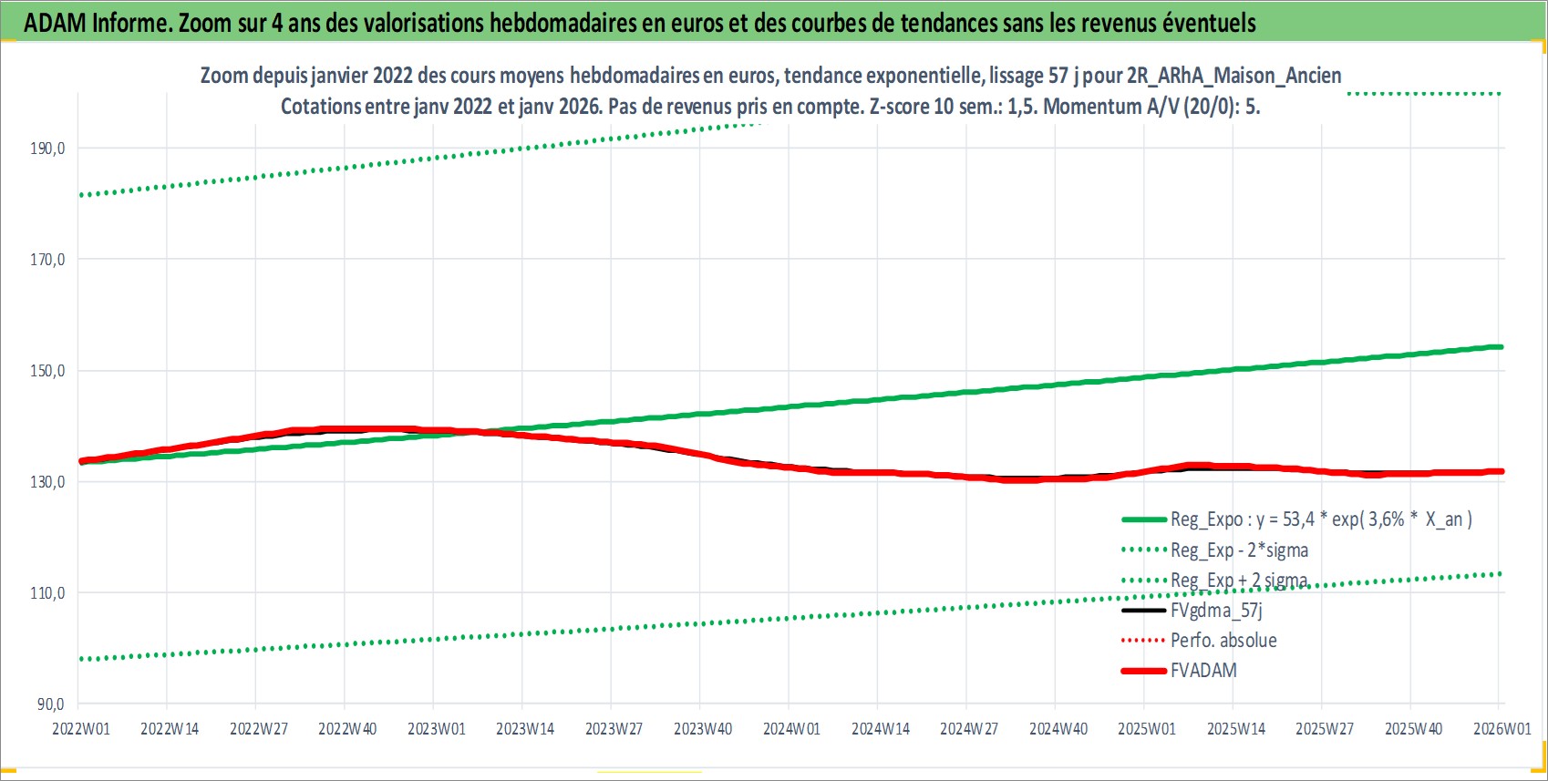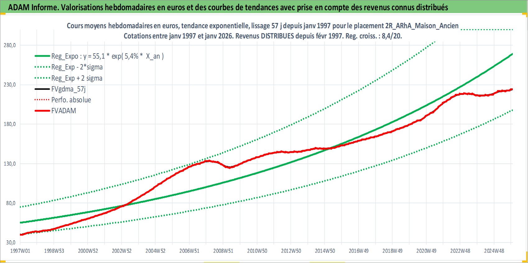Site dédié aux investisseursPage dédiée sur site financeAnalyse des valorisations hebdomadaires de l'actif 2R_ARhA_Maison_Ancien. Cet actif est cote en EUR. Les valorisations couvrent les semaines 1997W01 a 2026W01. Les loyers de cet actif immobilier sont pris egaux a 3,33% annuels de la valeur venale du logement.