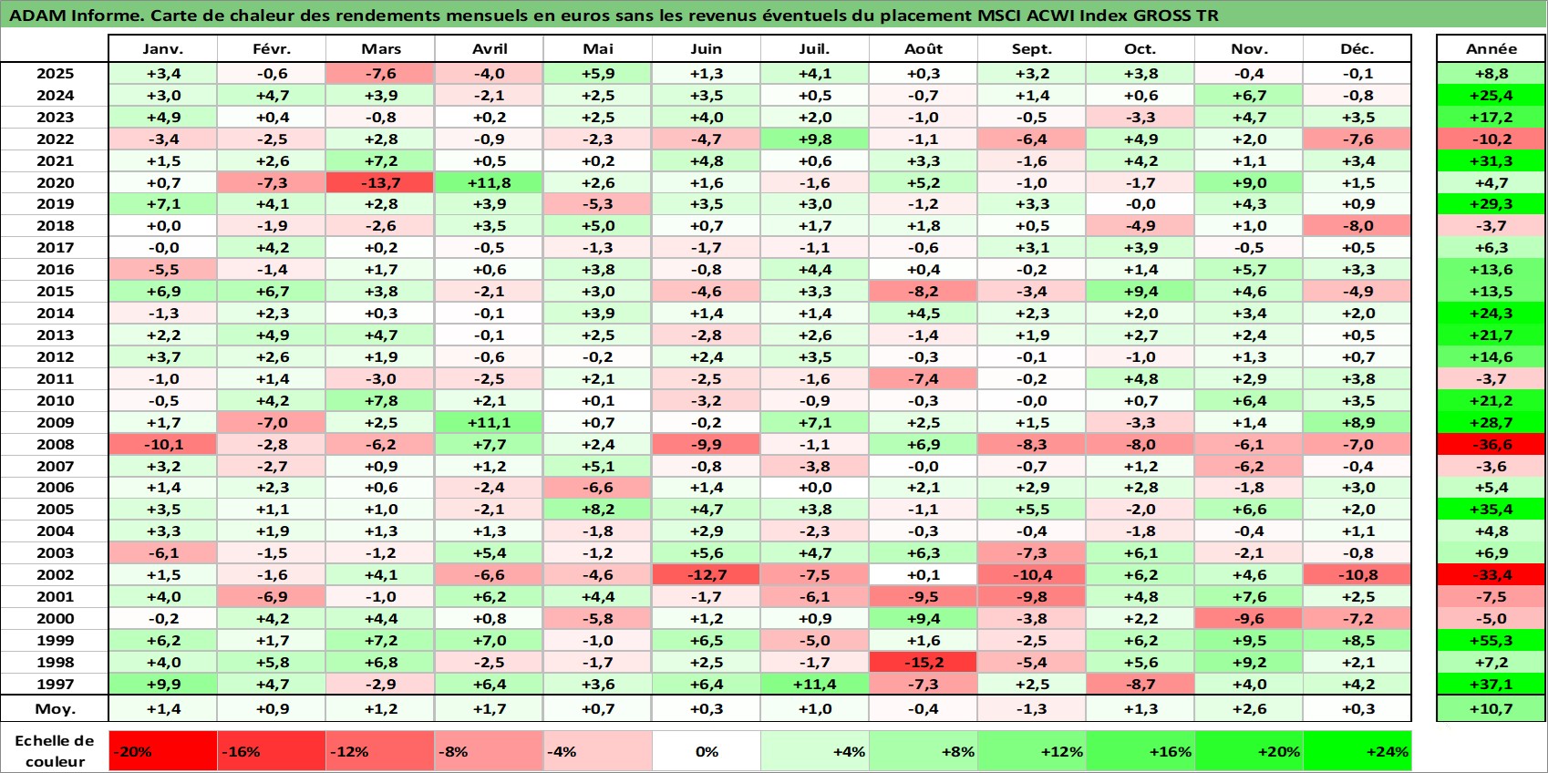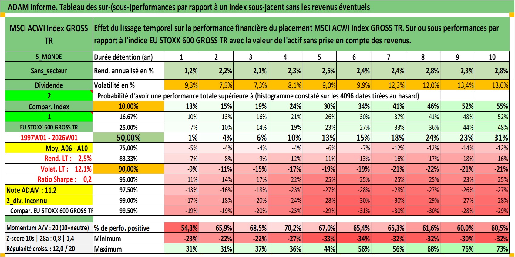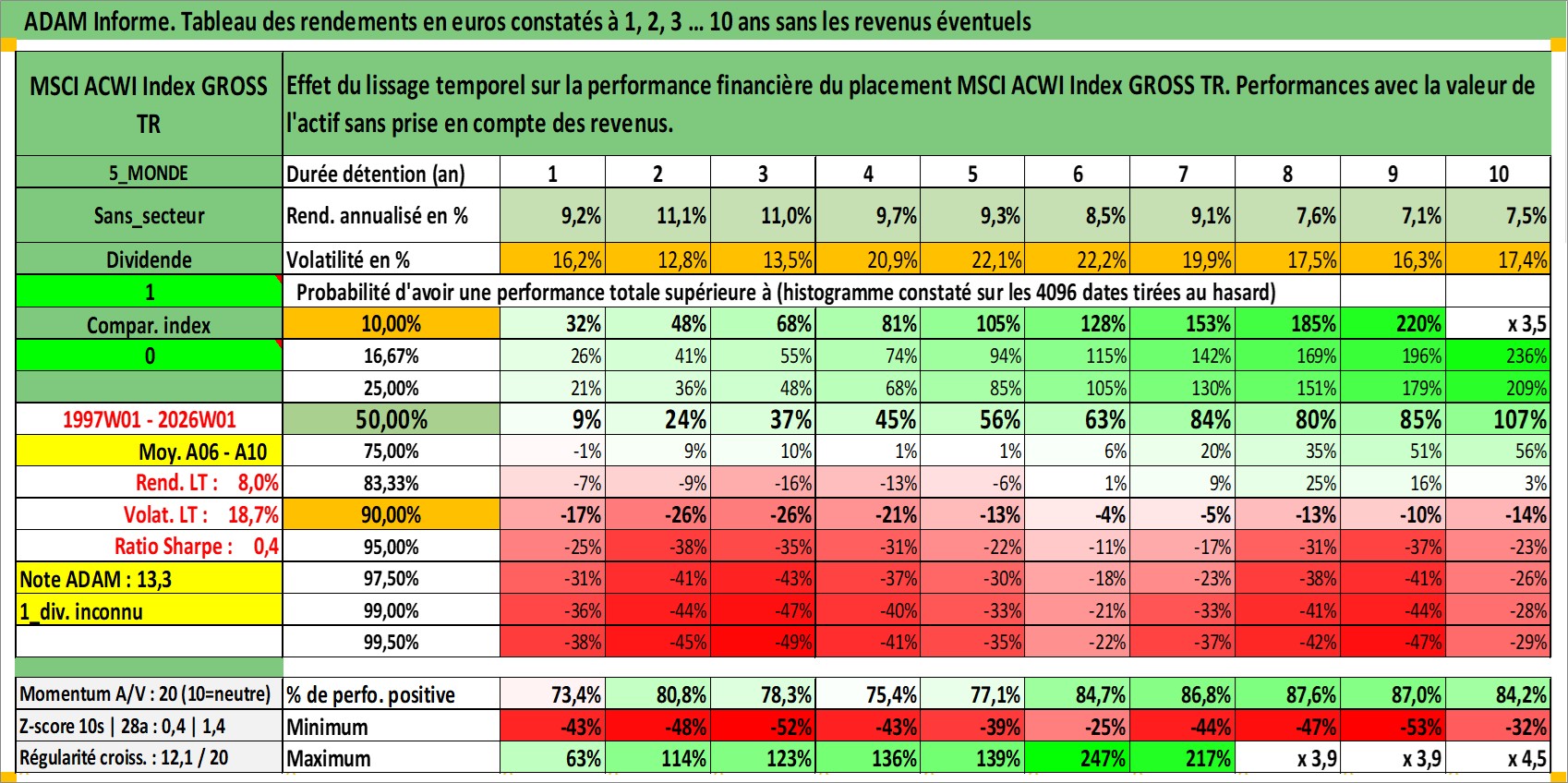 Site dédié aux investisseursPage dédiée sur site financeAnalyse des valorisations hebdomadaires de l'actif MSCI ACWI Index GROSS TR. Cet actif est cote en USD. Les valorisations sont en contrevaleur EURO et couvrent les semaines 1997W01 a 2026W01. Les revenus de cet actif financier ne sont pas connus car non existants ou non disponibles sur le site Yahoo Finance. La note ESG de cet actif n'est pas connue.