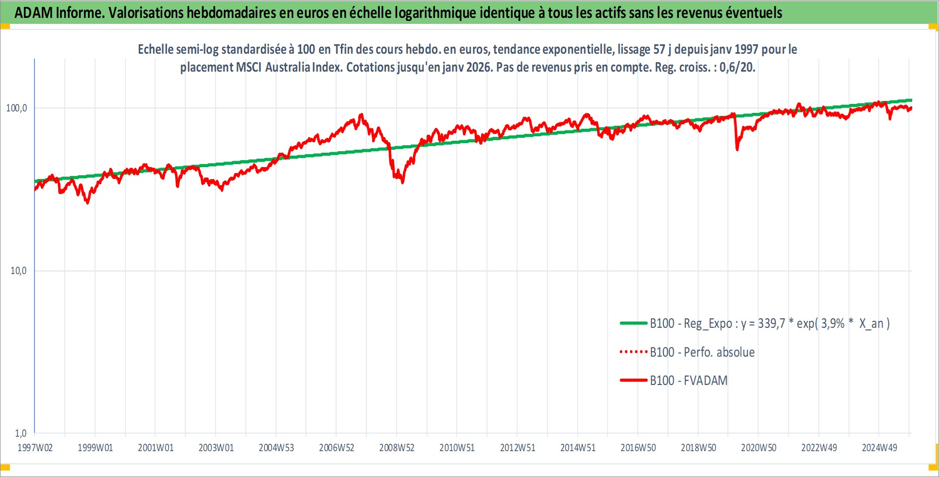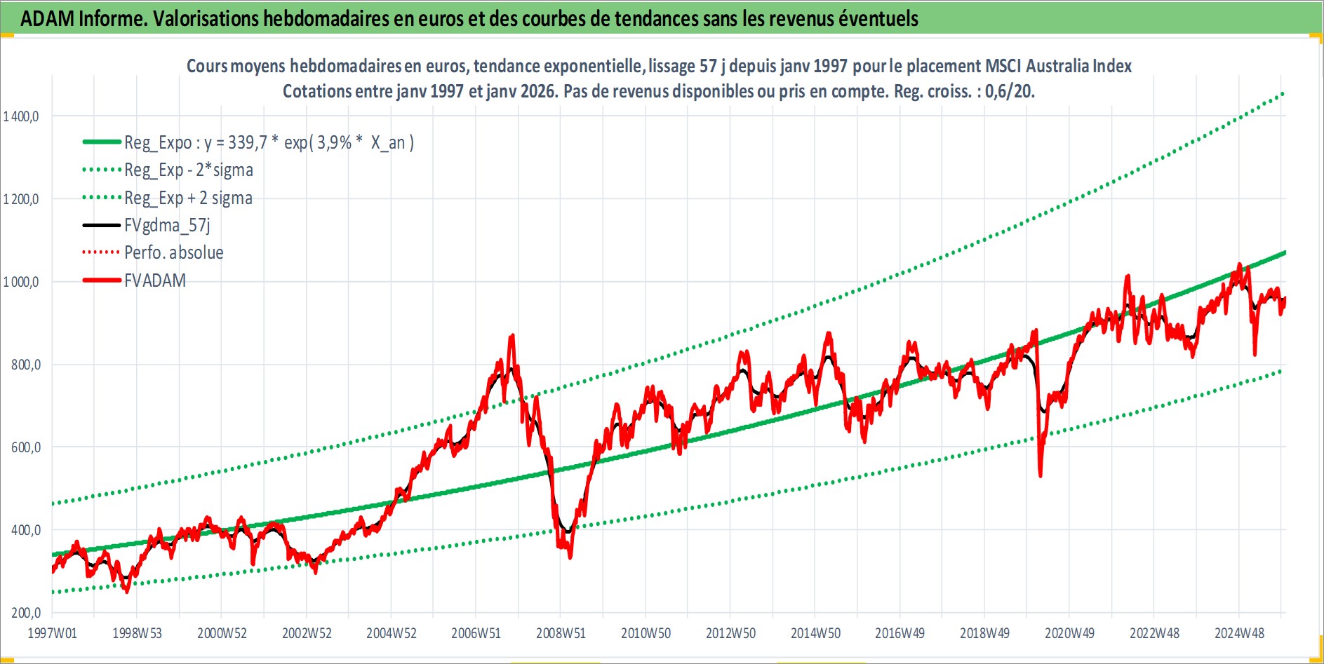 Site dédié aux investisseursPage dédiée sur site financeAnalyse des valorisations hebdomadaires de l'actif MSCI Australia Index. Cet actif est cote en AUD. Les valorisations sont en contrevaleur EURO et couvrent les semaines 1997W01 a 2026W01. Les revenus de cet actif financier ne sont pas connus car non existants ou non disponibles sur le site Yahoo Finance. La note ESG de cet actif n'est pas connue.