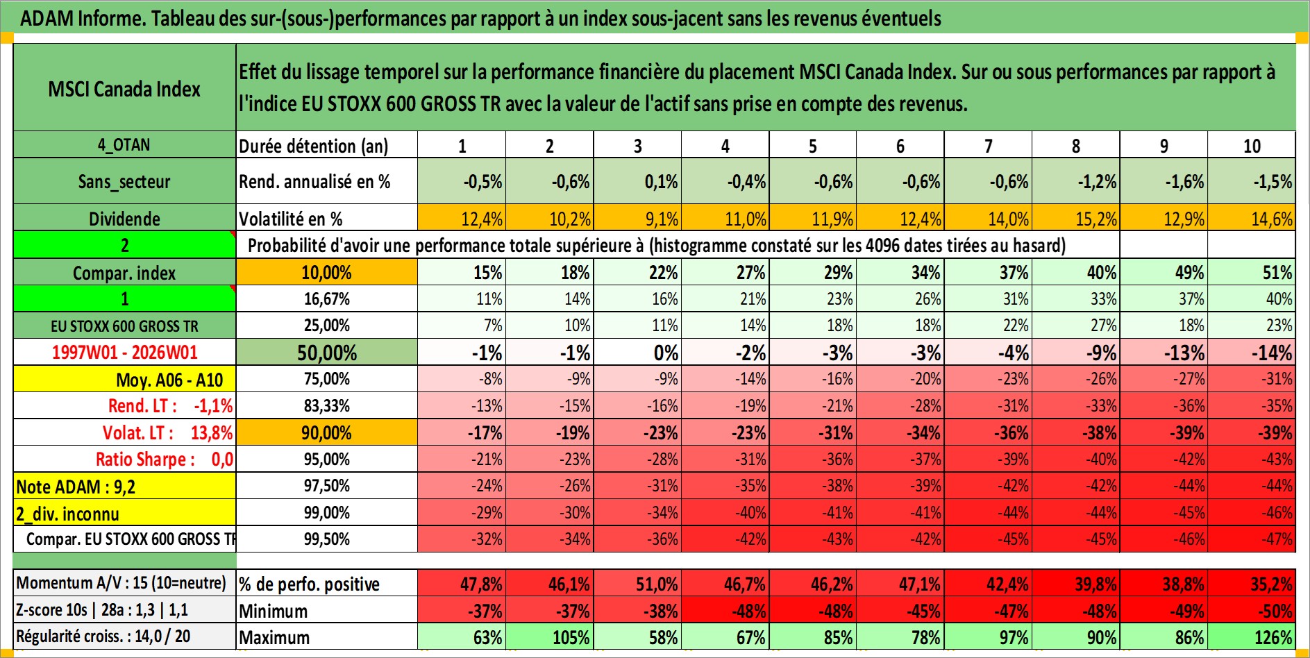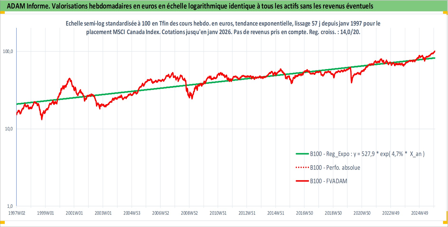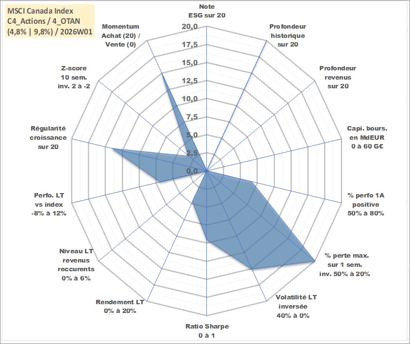 Site dédié aux investisseursPage dédiée sur site financeAnalyse des valorisations hebdomadaires de l'actif MSCI Canada Index. Cet actif est cote en CAD. Les valorisations sont en contrevaleur EURO et couvrent les semaines 1997W01 a 2026W01. Les revenus de cet actif financier ne sont pas connus car non existants ou non disponibles sur le site Yahoo Finance. La note ESG de cet actif n'est pas connue.