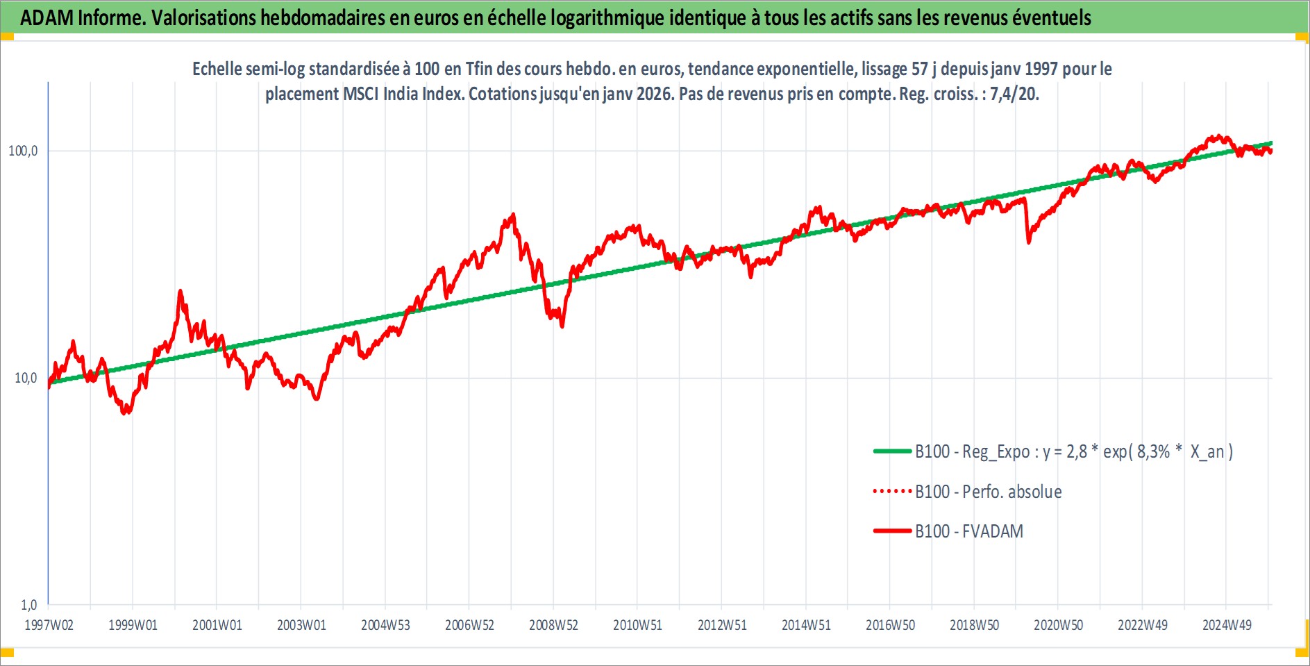 Site dédié aux investisseursPage dédiée sur site financeAnalyse des valorisations hebdomadaires de l'actif MSCI India Index. Cet actif est cote en INR. Les valorisations sont en contrevaleur EURO et couvrent les semaines 1997W01 a 2026W01. Les revenus de cet actif financier ne sont pas connus car non existants ou non disponibles sur le site Yahoo Finance. La note ESG de cet actif n'est pas connue.