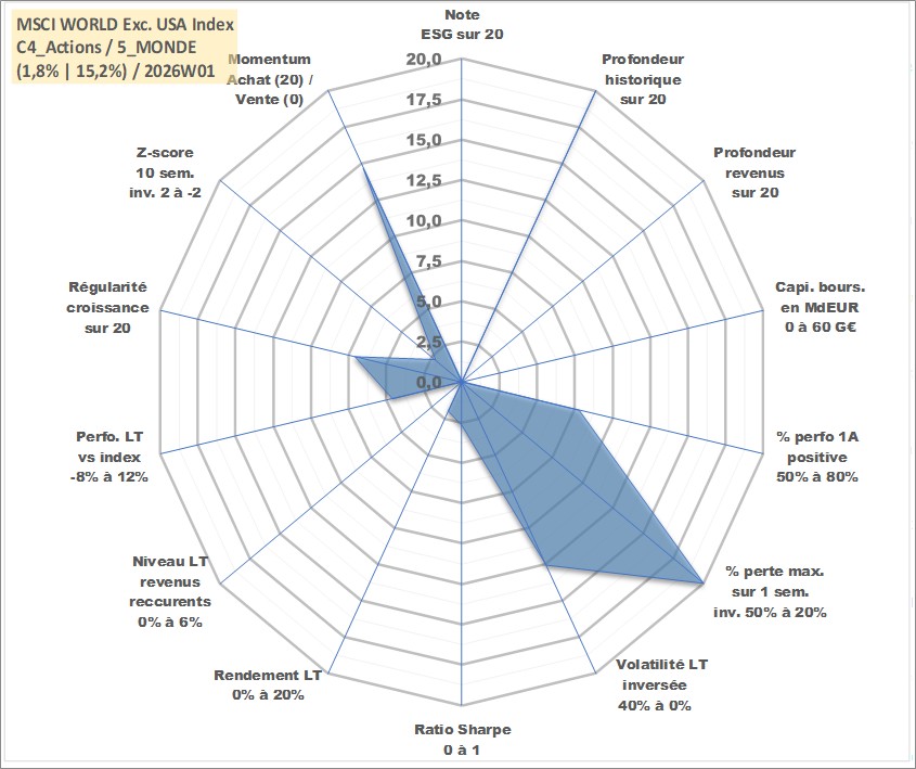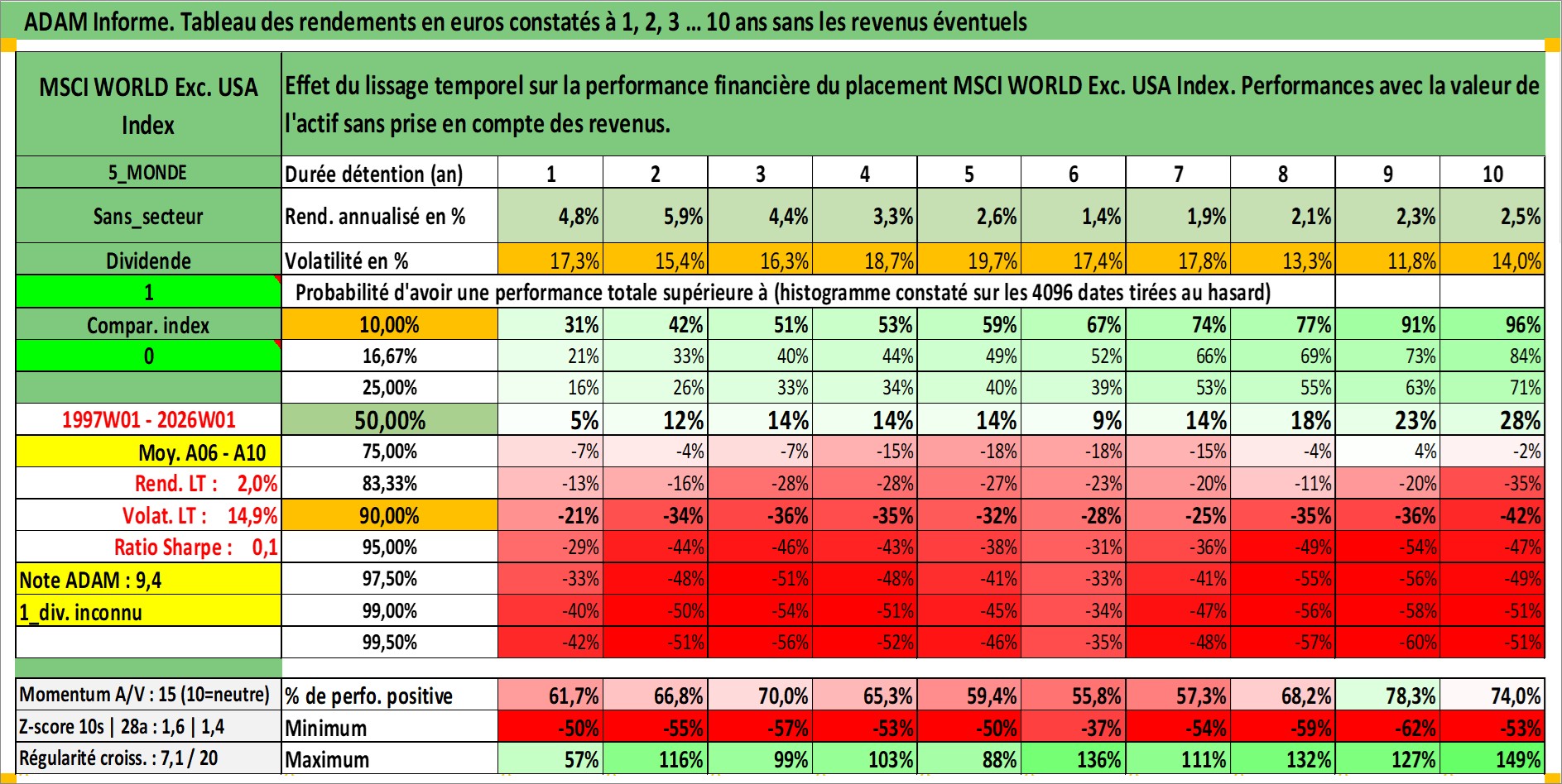 Site dédié aux investisseursPage dédiée sur site financeAnalyse des valorisations hebdomadaires de l'actif MSCI WORLD Exc. USA Index. Cet actif est cote en USD. Les valorisations sont en contrevaleur EURO et couvrent les semaines 1997W01 a 2026W01. Les revenus de cet actif financier ne sont pas connus car non existants ou non disponibles sur le site Yahoo Finance. La note ESG de cet actif n'est pas connue.