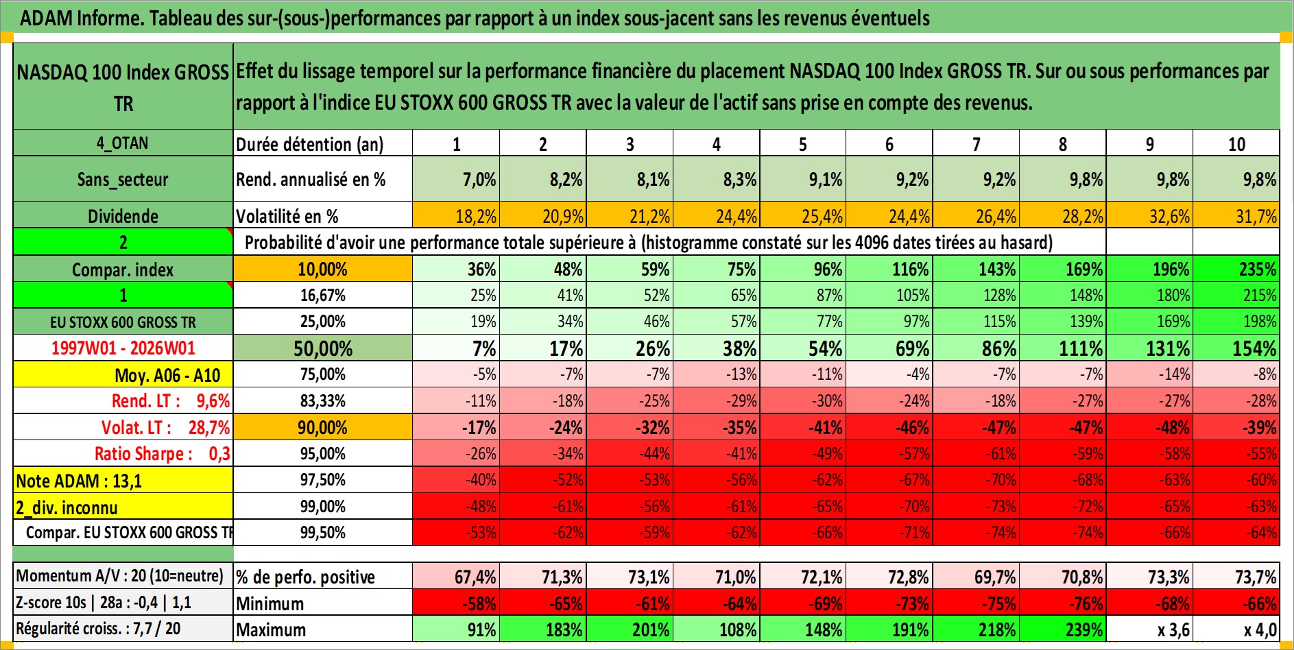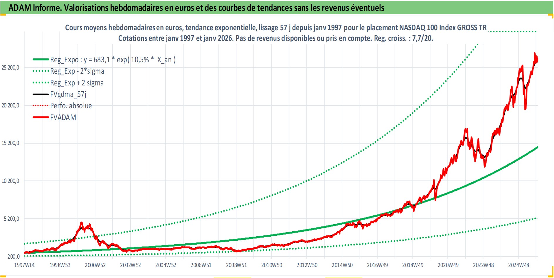 Site dédié aux investisseursPage dédiée sur site financeAnalyse des valorisations hebdomadaires de l'actif NASDAQ 100 Index GROSS TR. Cet actif est cote en USD. Les valorisations sont en contrevaleur EURO et couvrent les semaines 1997W01 a 2026W01. Les revenus de cet actif financier ne sont pas connus car non existants ou non disponibles sur le site Yahoo Finance. La note ESG de cet actif n'est pas connue.
