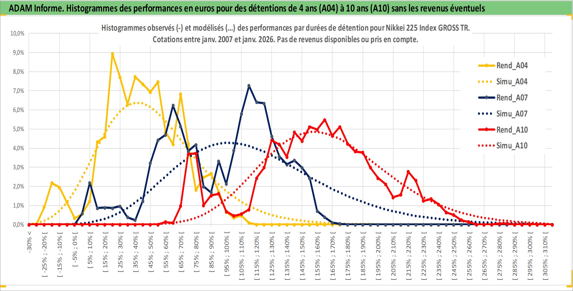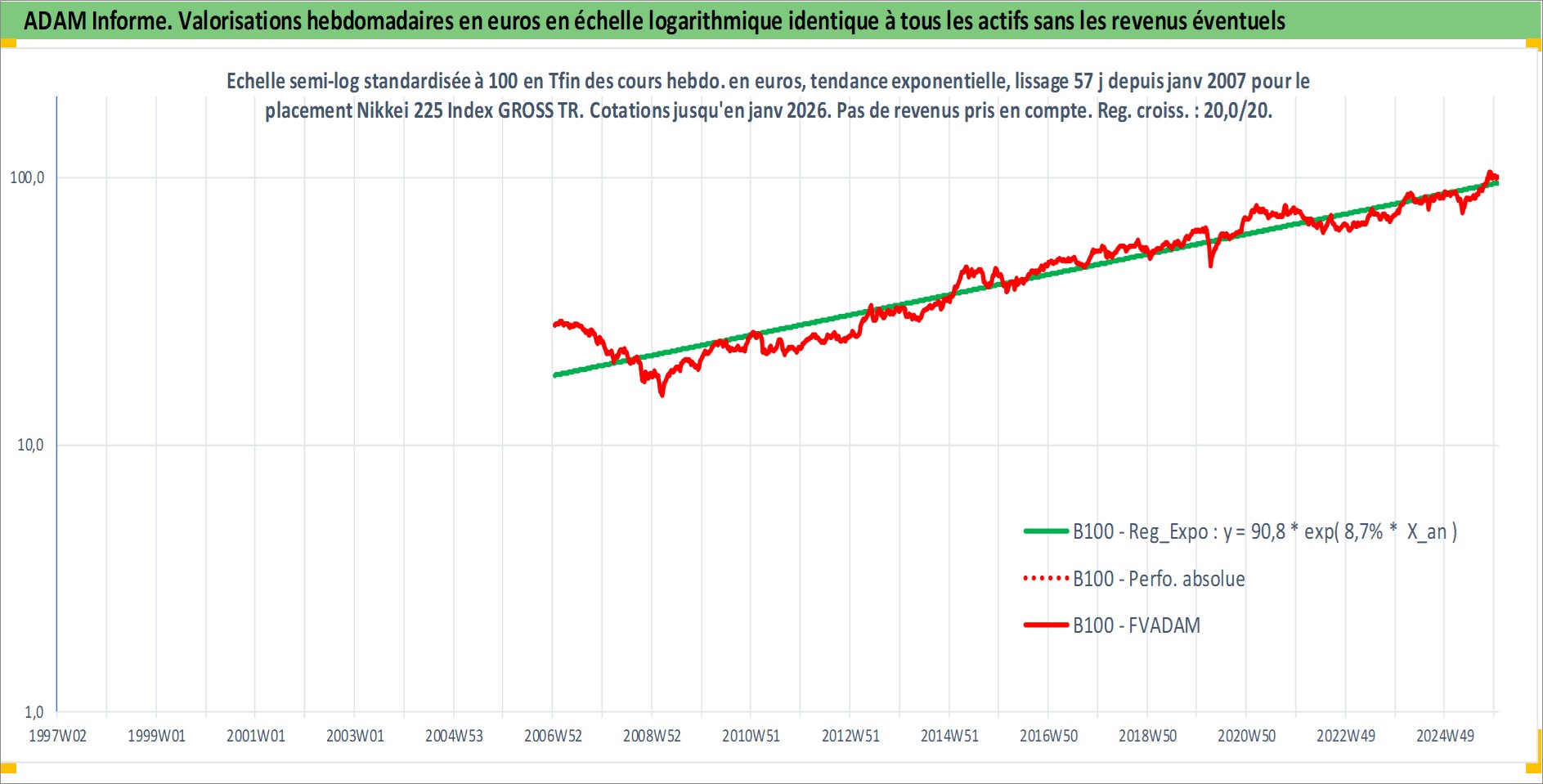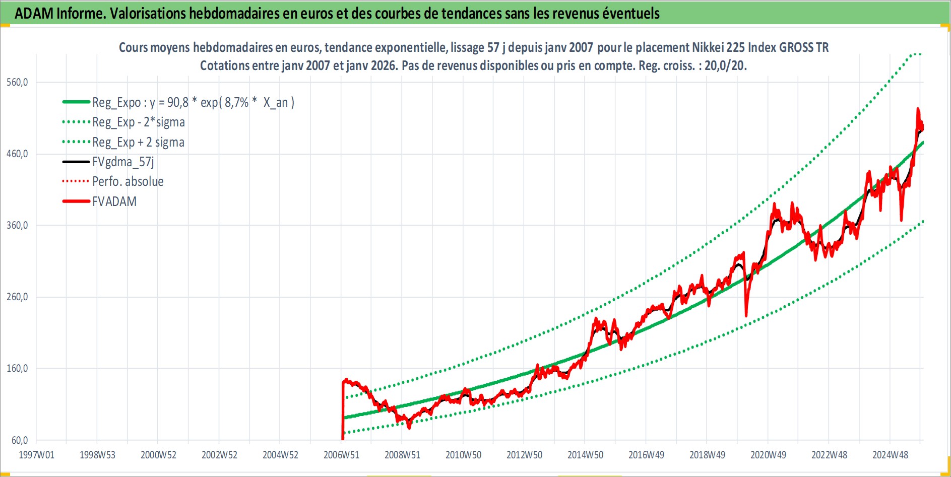 Site dédié aux investisseursPage dédiée sur site financeAnalyse des valorisations hebdomadaires de l'actif Nikkei 225 Index GROSS TR. Cet actif est cote en JPY. Les valorisations sont en contrevaleur EURO et couvrent les semaines 2007W02 a 2026W01. Les revenus de cet actif financier ne sont pas connus car non existants ou non disponibles sur le site Yahoo Finance. La note ESG de cet actif n'est pas connue.