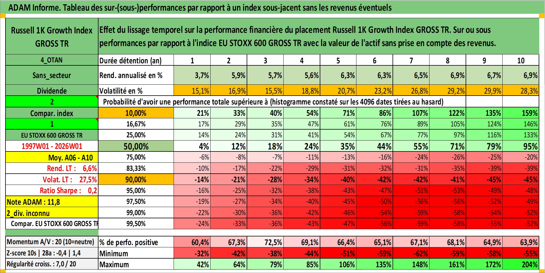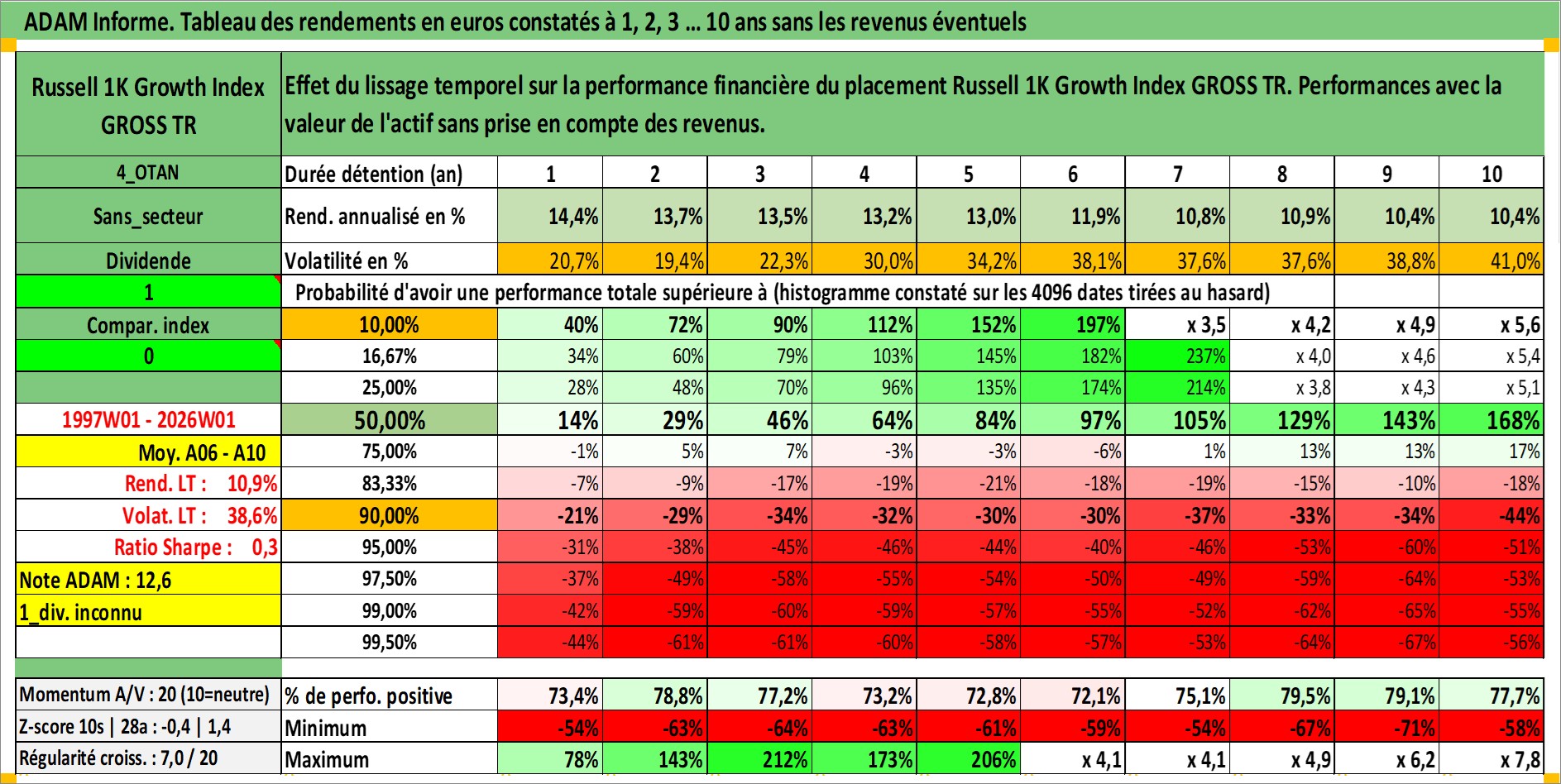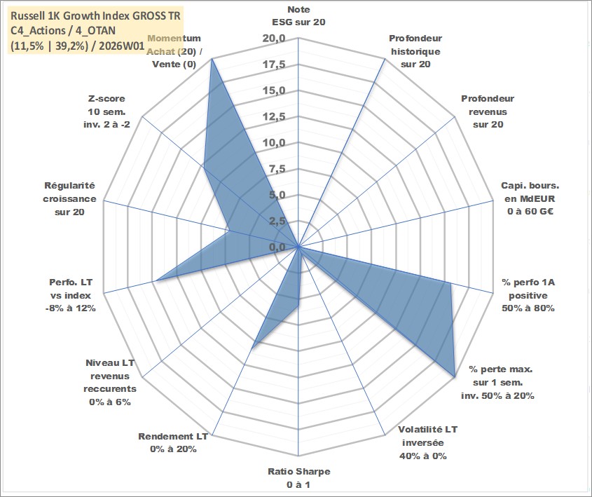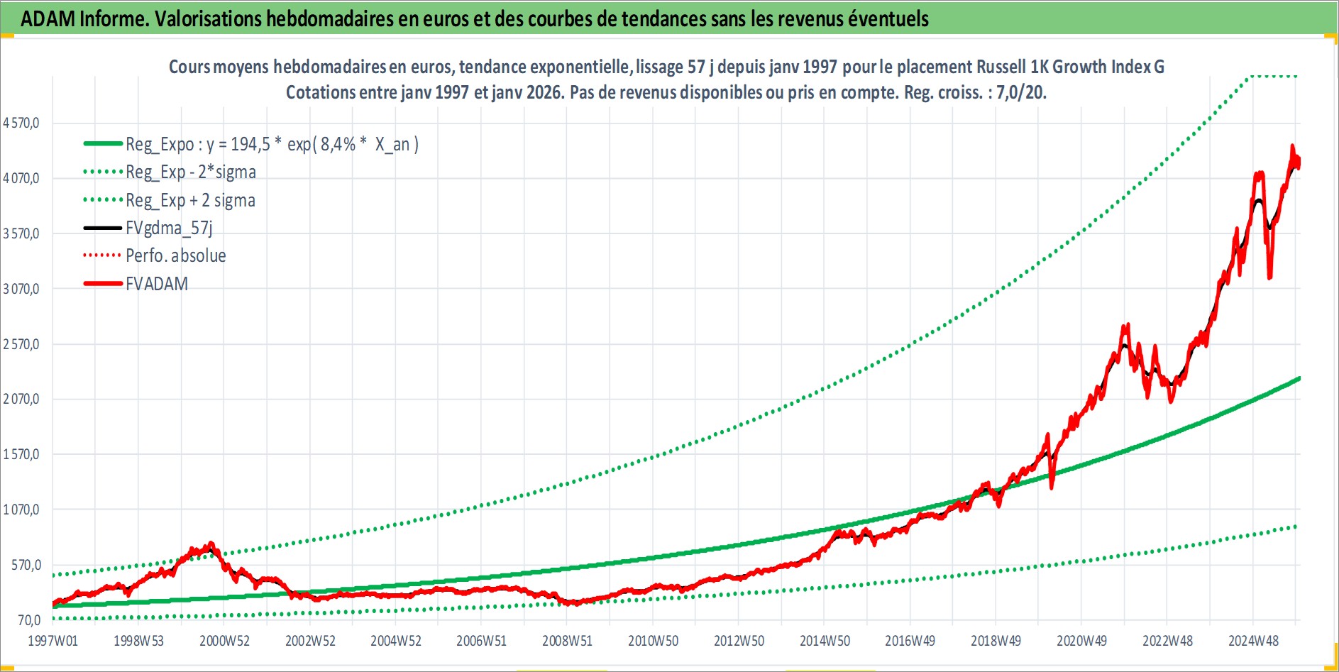 Site dédié aux investisseursPage dédiée sur site financeAnalyse des valorisations hebdomadaires de l'actif Russell 1K Growth Index GROSS TR. Cet actif est cote en USD. Les valorisations sont en contrevaleur EURO et couvrent les semaines 1997W01 a 2026W01. Les revenus de cet actif financier ne sont pas connus car non existants ou non disponibles sur le site Yahoo Finance. La note ESG de cet actif n'est pas connue.