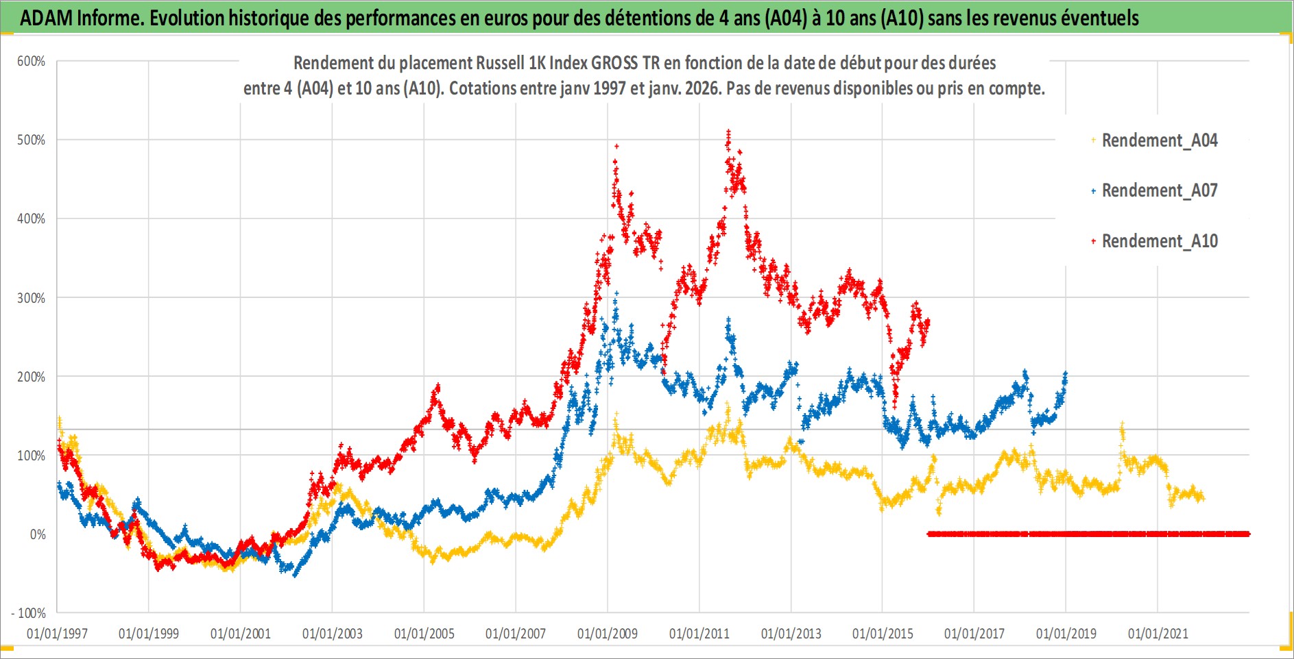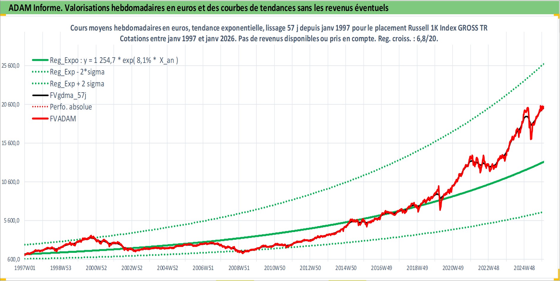 Site dédié aux investisseursPage dédiée sur site financeAnalyse des valorisations hebdomadaires de l'actif Russell 1K Index GROSS TR. Cet actif est cote en USD. Les valorisations sont en contrevaleur EURO et couvrent les semaines 1997W01 a 2026W01. Les revenus de cet actif financier ne sont pas connus car non existants ou non disponibles sur le site Yahoo Finance. La note ESG de cet actif n'est pas connue.