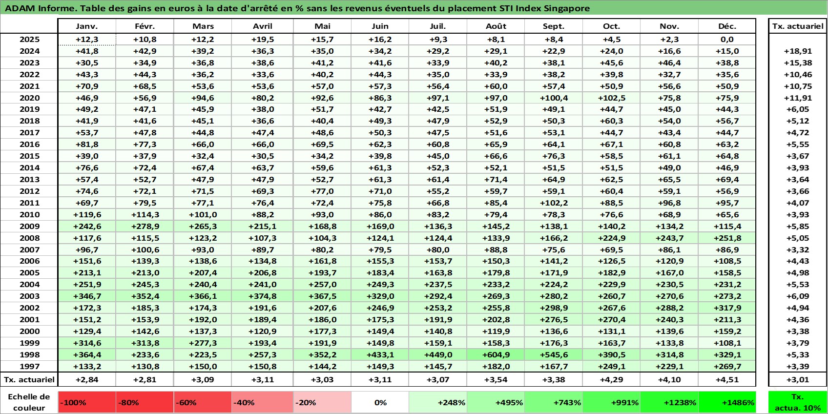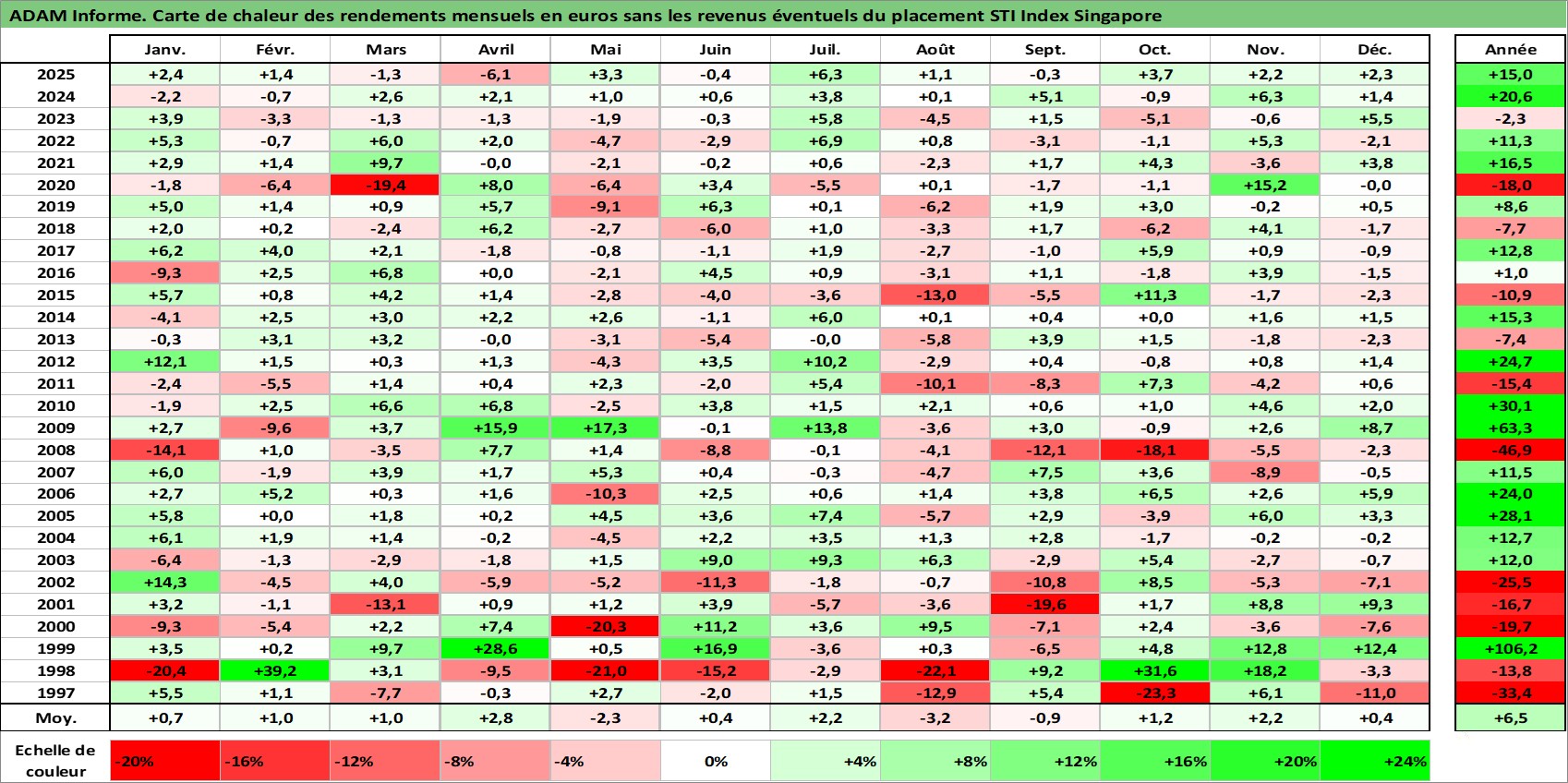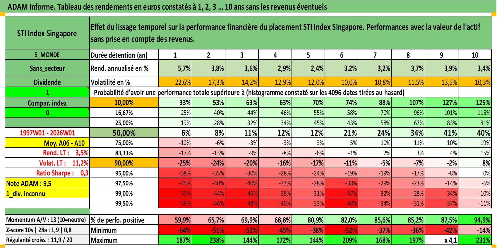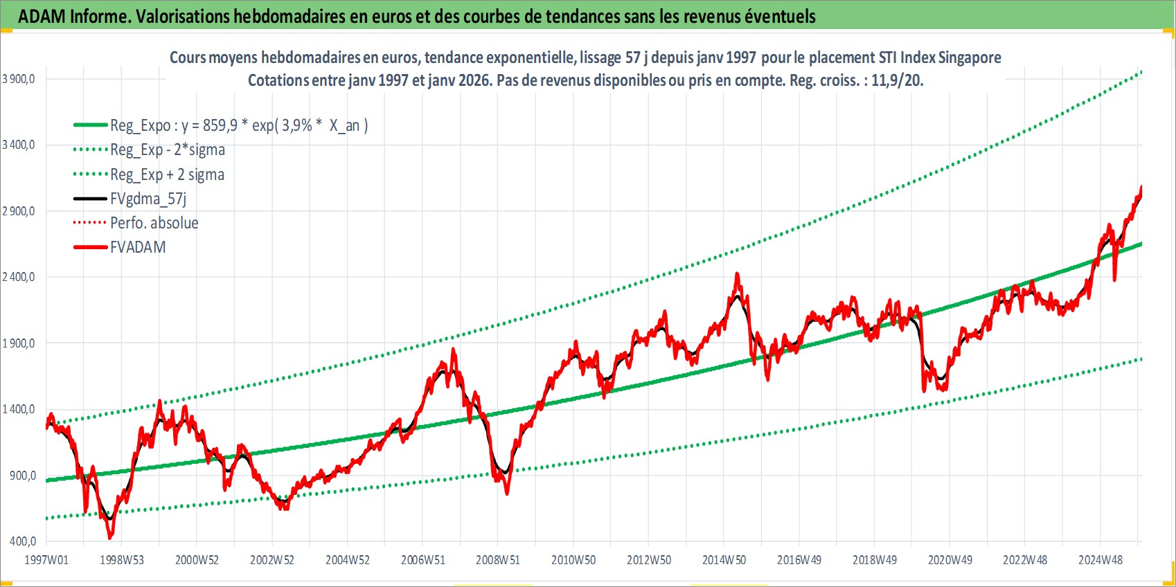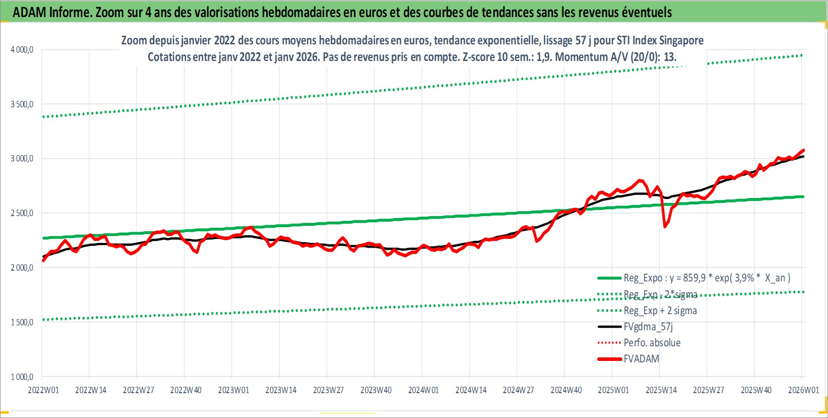 Site dédié aux investisseursPage dédiée sur site financeAnalyse des valorisations hebdomadaires de l'actif STI Index Singapore. Cet actif est cote en SGD. Les valorisations sont en contrevaleur EURO et couvrent les semaines 1997W01 a 2026W01. Les revenus de cet actif financier ne sont pas connus car non existants ou non disponibles sur le site Yahoo Finance. La note ESG de cet actif n'est pas connue.
