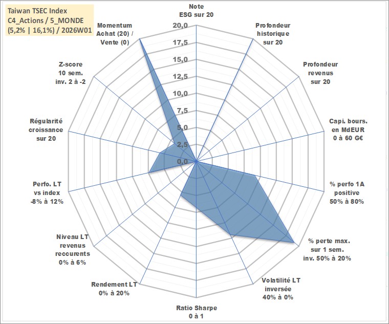 Site dédié aux investisseursPage dédiée sur site financeAnalyse des valorisations hebdomadaires de l'actif Taiwan TSEC Index. Cet actif est cote en TWD. Les valorisations sont en contrevaleur EURO et couvrent les semaines 1997W01 a 2026W01. Les revenus de cet actif financier ne sont pas connus car non existants ou non disponibles sur le site Yahoo Finance. La note ESG de cet actif n'est pas connue.