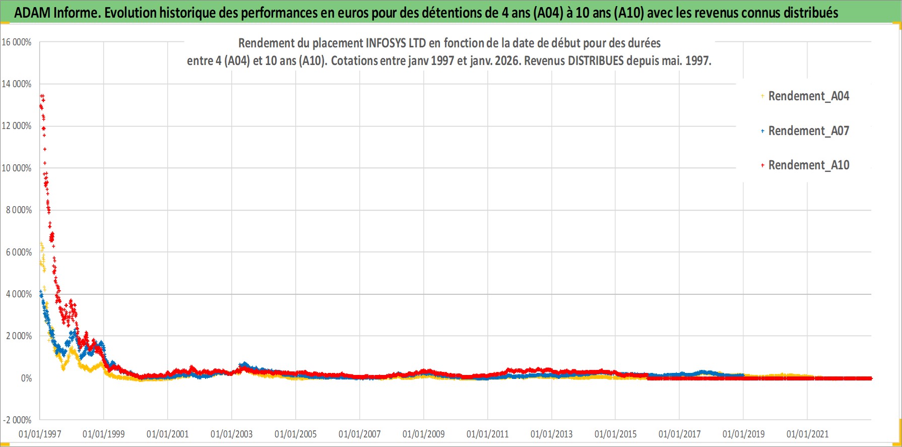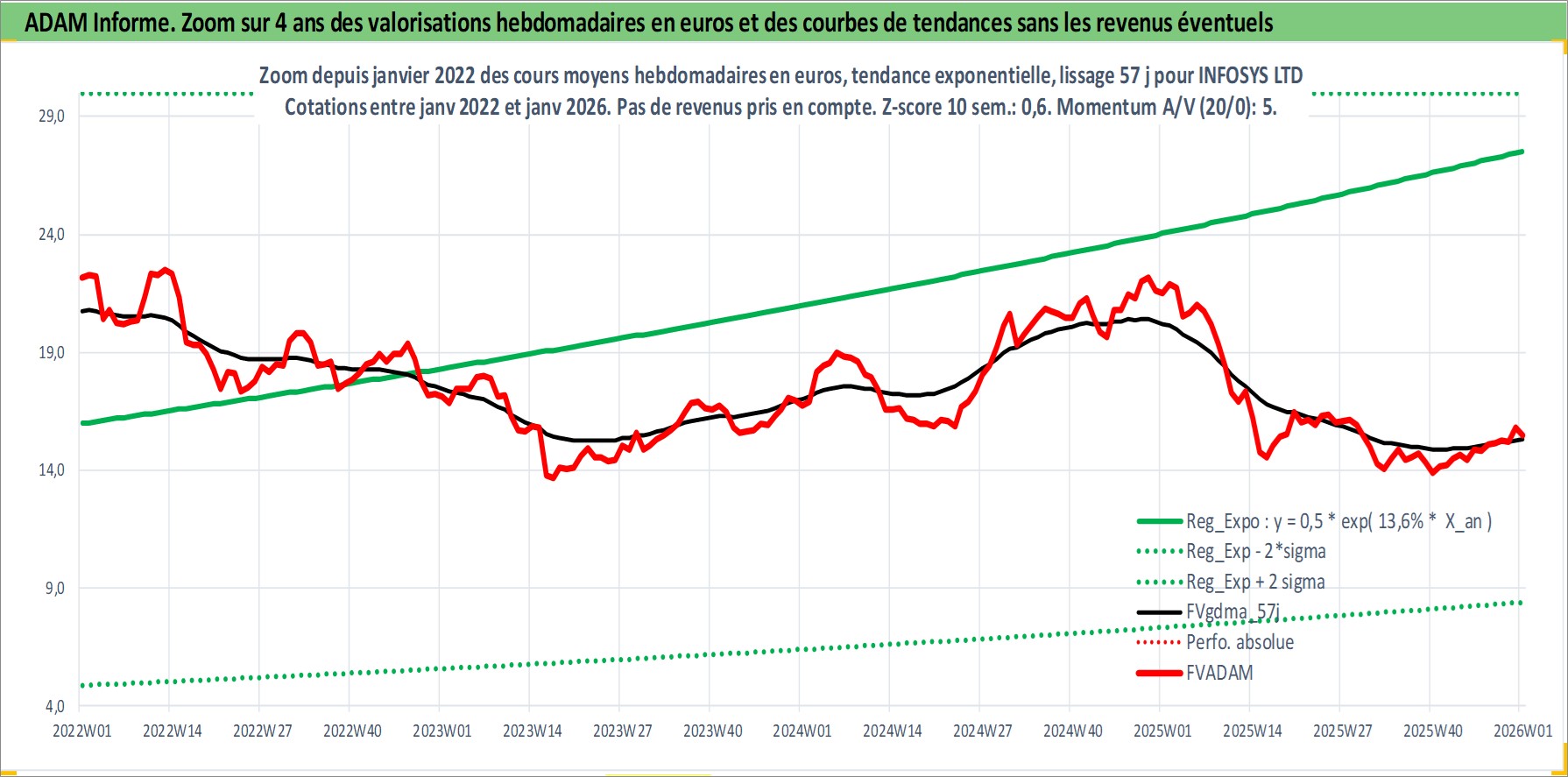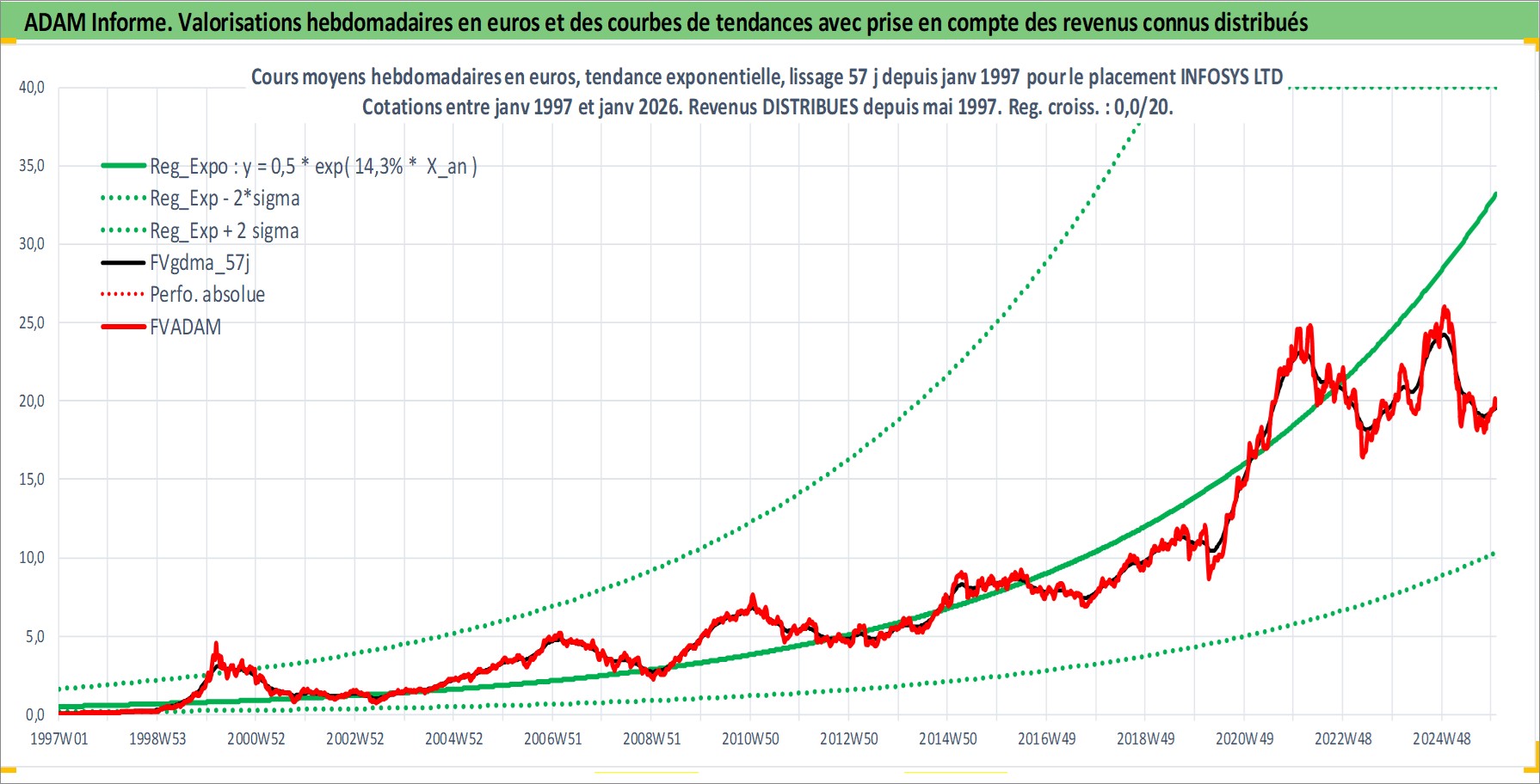 Site dédié aux investisseursPage dédiée sur site financeAnalyse des valorisations hebdomadaires de l'action INFOSYS LTD. Cet actif est cote en INR. Les valorisations sont en contrevaleur EURO et couvrent les semaines 1997W01 a 2026W01. Les revenus de cet actif financier sont pris en compte depuis la semaine 1997W21. La note globale ESG de cet actif est estimee a 13.0 (apres rebasage entre 0 et 20).