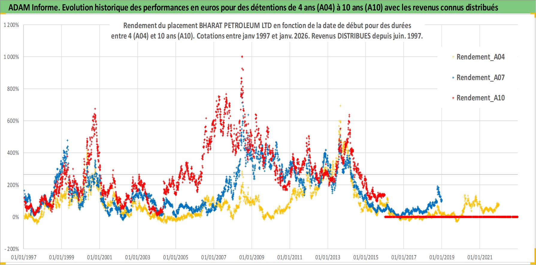 Site dédié aux investisseursPage dédiée sur site financeAnalyse des valorisations hebdomadaires de l'action BHARAT PETROLEUM LTD. Cet actif est cote en INR. Les valorisations sont en contrevaleur EURO et couvrent les semaines 1997W01 a 2026W01. Les revenus de cet actif financier sont pris en compte depuis la semaine 1997W26. La note globale ESG de cet actif est estimee a 3.0 (apres rebasage entre 0 et 20).
