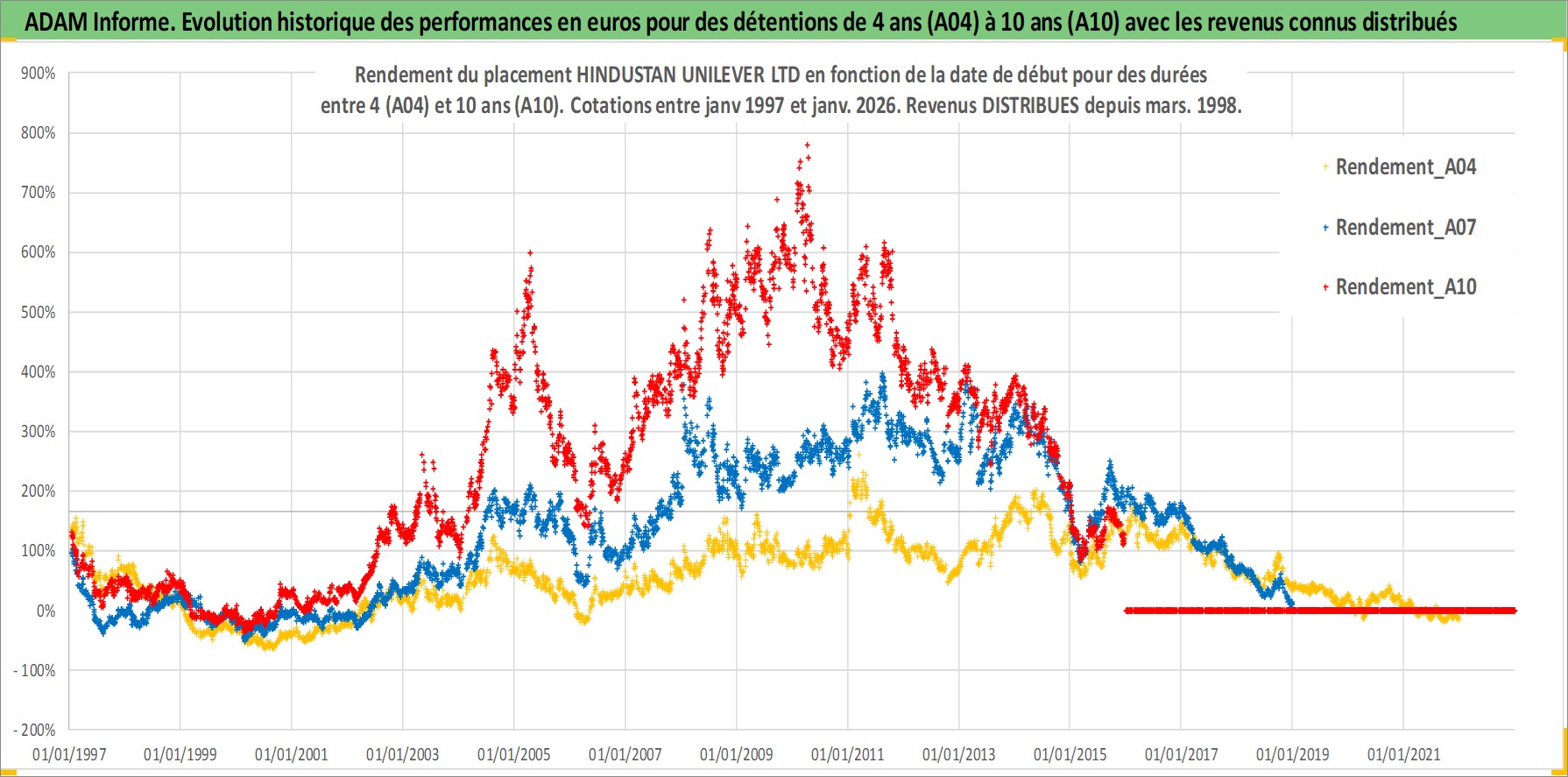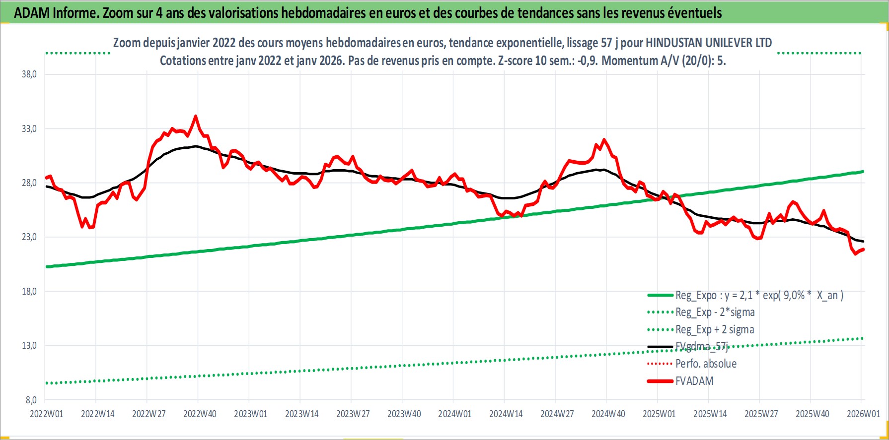 Site dédié aux investisseursPage dédiée sur site financeAnalyse des valorisations hebdomadaires de l'action HINDUSTAN UNILEVER LTD. Cet actif est cote en INR. Les valorisations sont en contrevaleur EURO et couvrent les semaines 1997W01 a 2026W01. Les revenus de cet actif financier sont pris en compte depuis la semaine 1998W12. La note globale ESG de cet actif est estimee a 7.0 (apres rebasage entre 0 et 20).