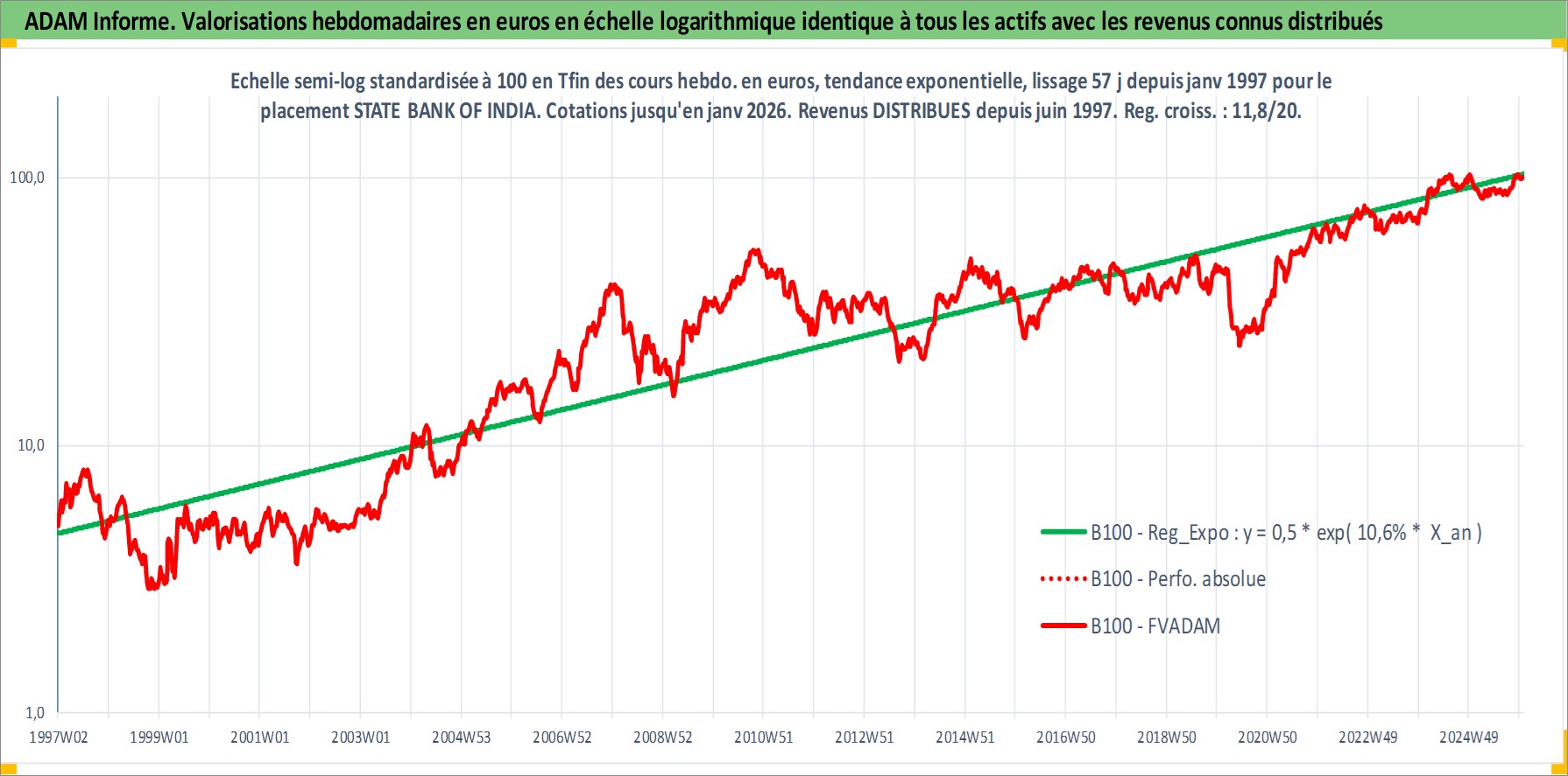 Site dédié aux investisseursPage dédiée sur site financeAnalyse des valorisations hebdomadaires de l'action STATE BANK OF INDIA. Cet actif est cote en INR. Les valorisations sont en contrevaleur EURO et couvrent les semaines 1997W01 a 2026W01. Les revenus de cet actif financier sont pris en compte depuis la semaine 1997W25. La note globale ESG de cet actif est estimee a 5.0 (apres rebasage entre 0 et 20).