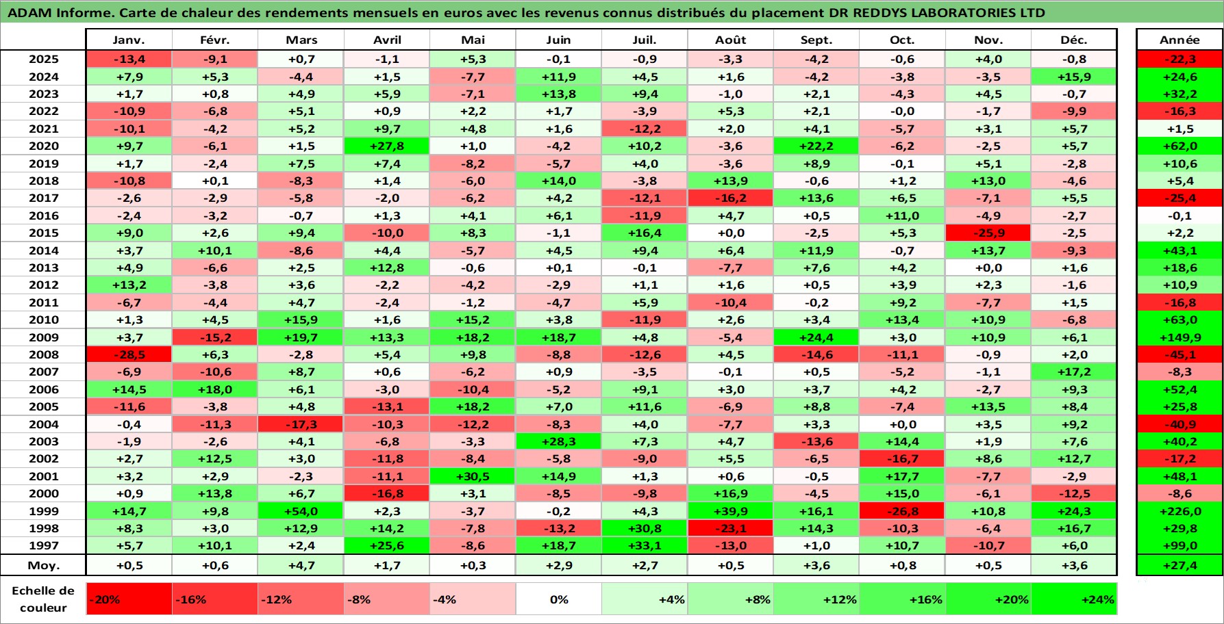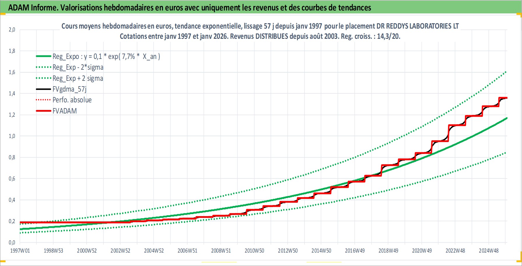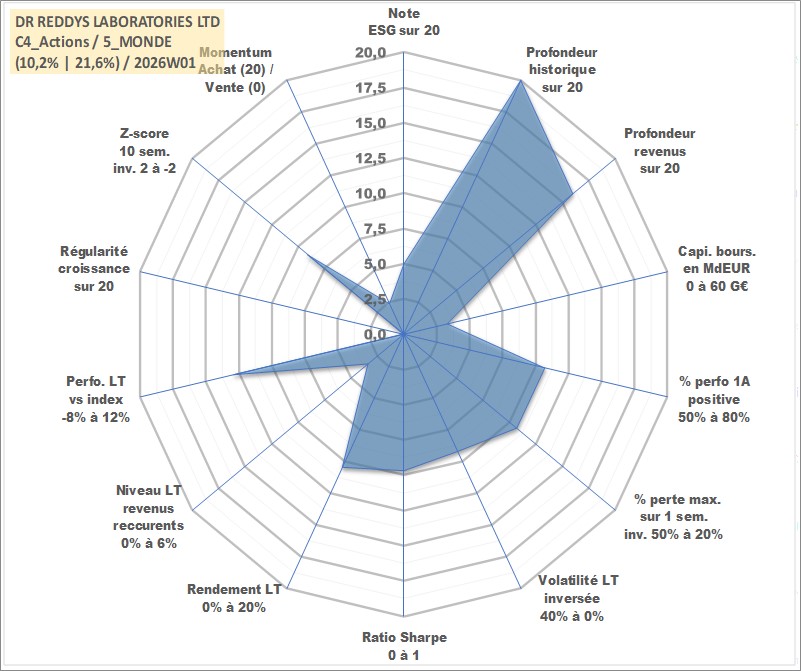 Site dédié aux investisseursPage dédiée sur site financeAnalyse des valorisations hebdomadaires de l'action DR REDDYS LABORATORIES LTD. Cet actif est cote en INR. Les valorisations sont en contrevaleur EURO et couvrent les semaines 1997W01 a 2026W01. Les revenus de cet actif financier sont pris en compte depuis la semaine 2003W32. La note globale ESG de cet actif est estimee a 5.0 (apres rebasage entre 0 et 20).