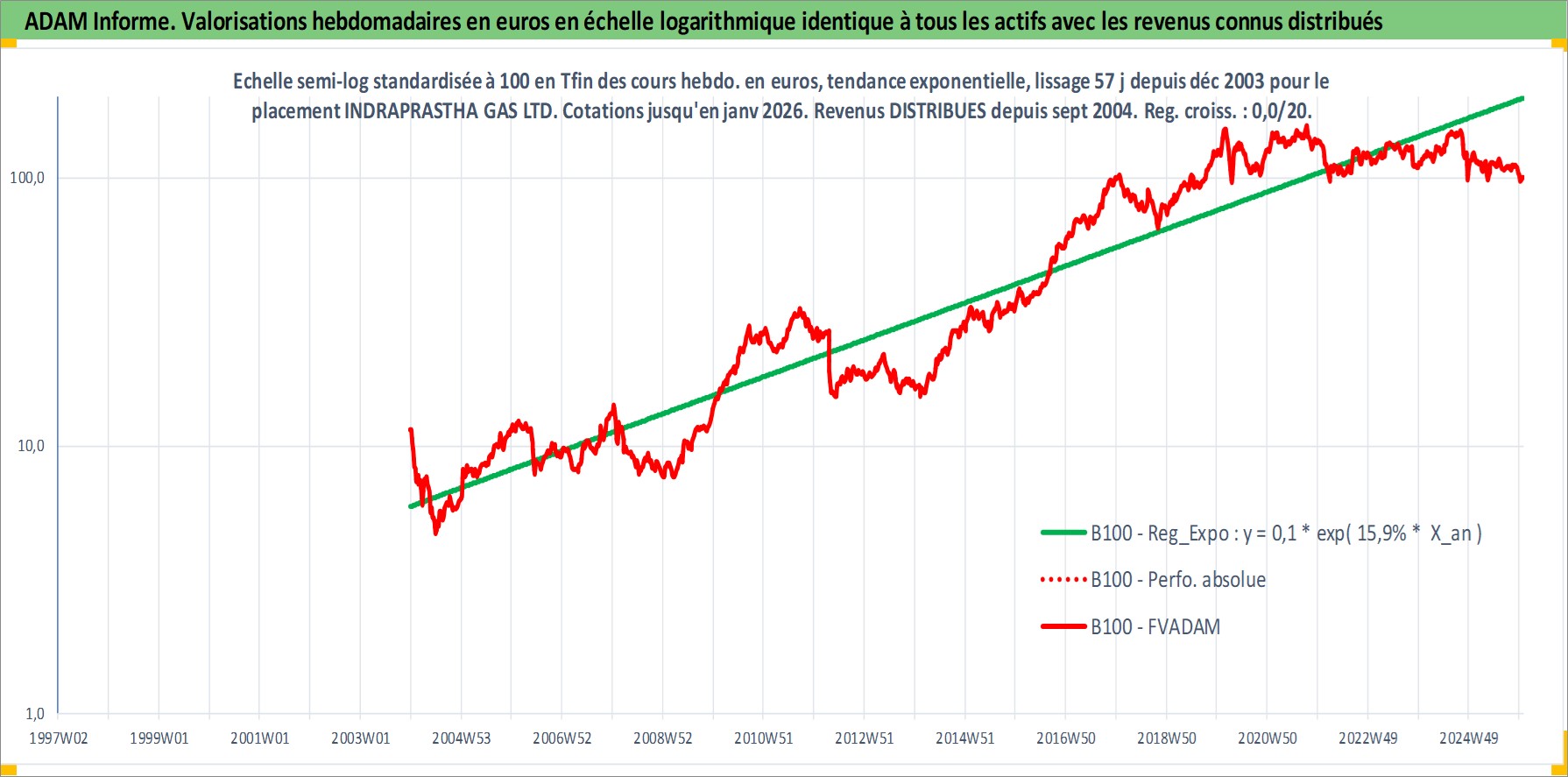 Site dédié aux investisseursPage dédiée sur site financeAnalyse des valorisations hebdomadaires de l'action INDRAPRASTHA GAS LTD. Cet actif est cote en INR. Les valorisations sont en contrevaleur EURO et couvrent les semaines 2003W52 a 2026W01. Les revenus de cet actif financier sont pris en compte depuis la semaine 2004W38. La note ESG de cet actif n'est pas connue.