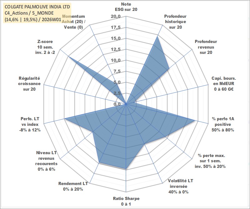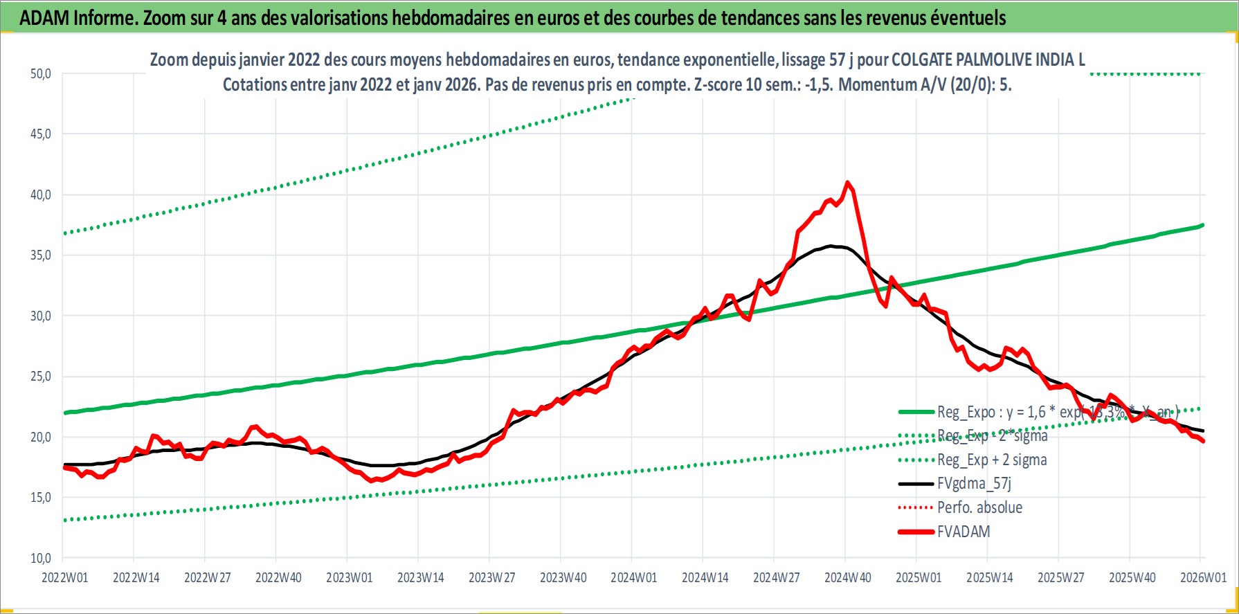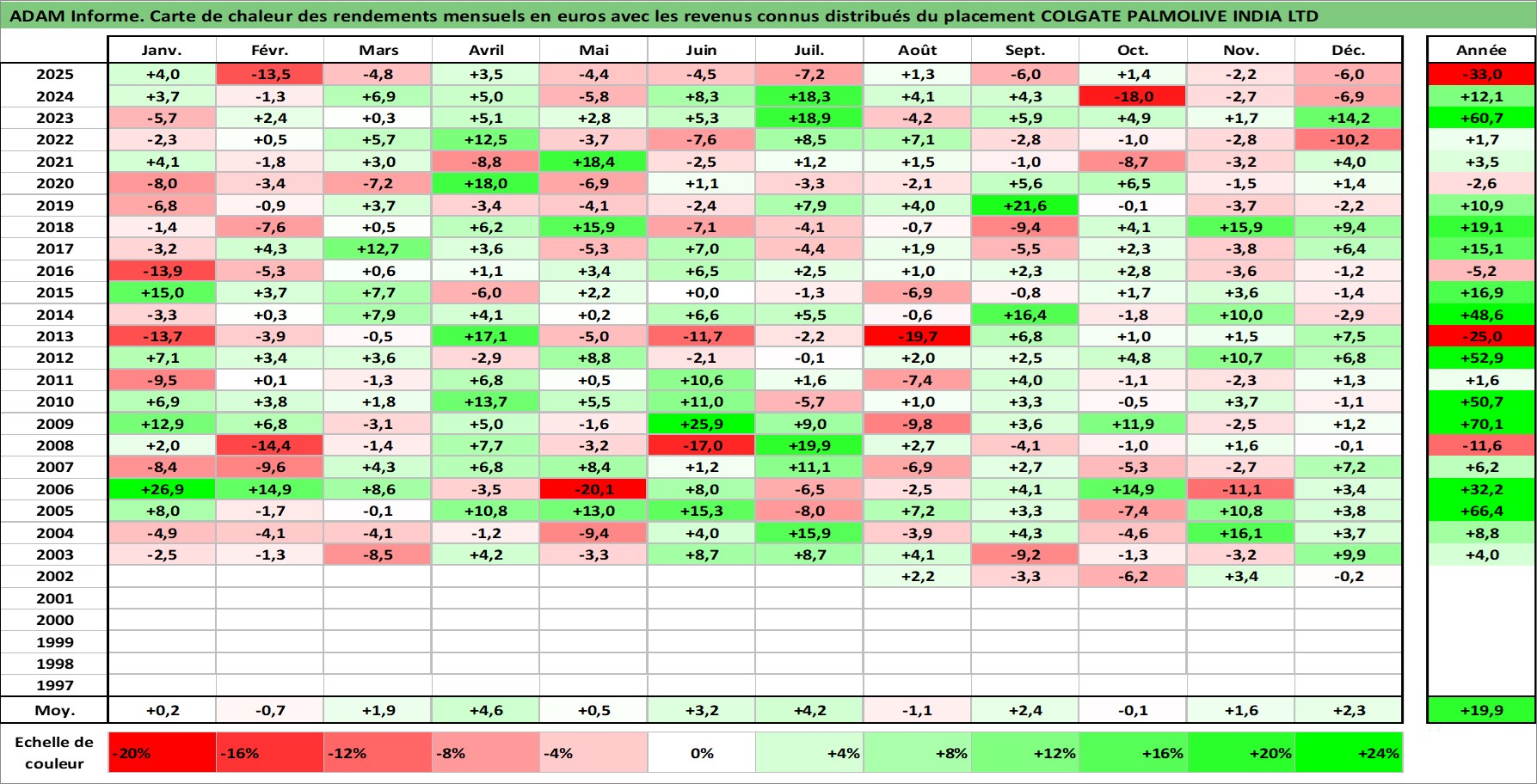Site dédié aux investisseursPage dédiée sur site financeAnalyse des valorisations hebdomadaires de l'action COLGATE PALMOLIVE INDIA LTD. Cet actif est cote en INR. Les valorisations sont en contrevaleur EURO et couvrent les semaines 2002W27 a 2026W01. Les revenus de cet actif financier sont pris en compte depuis la semaine 2007W29. La note ESG de cet actif n'est pas connue.