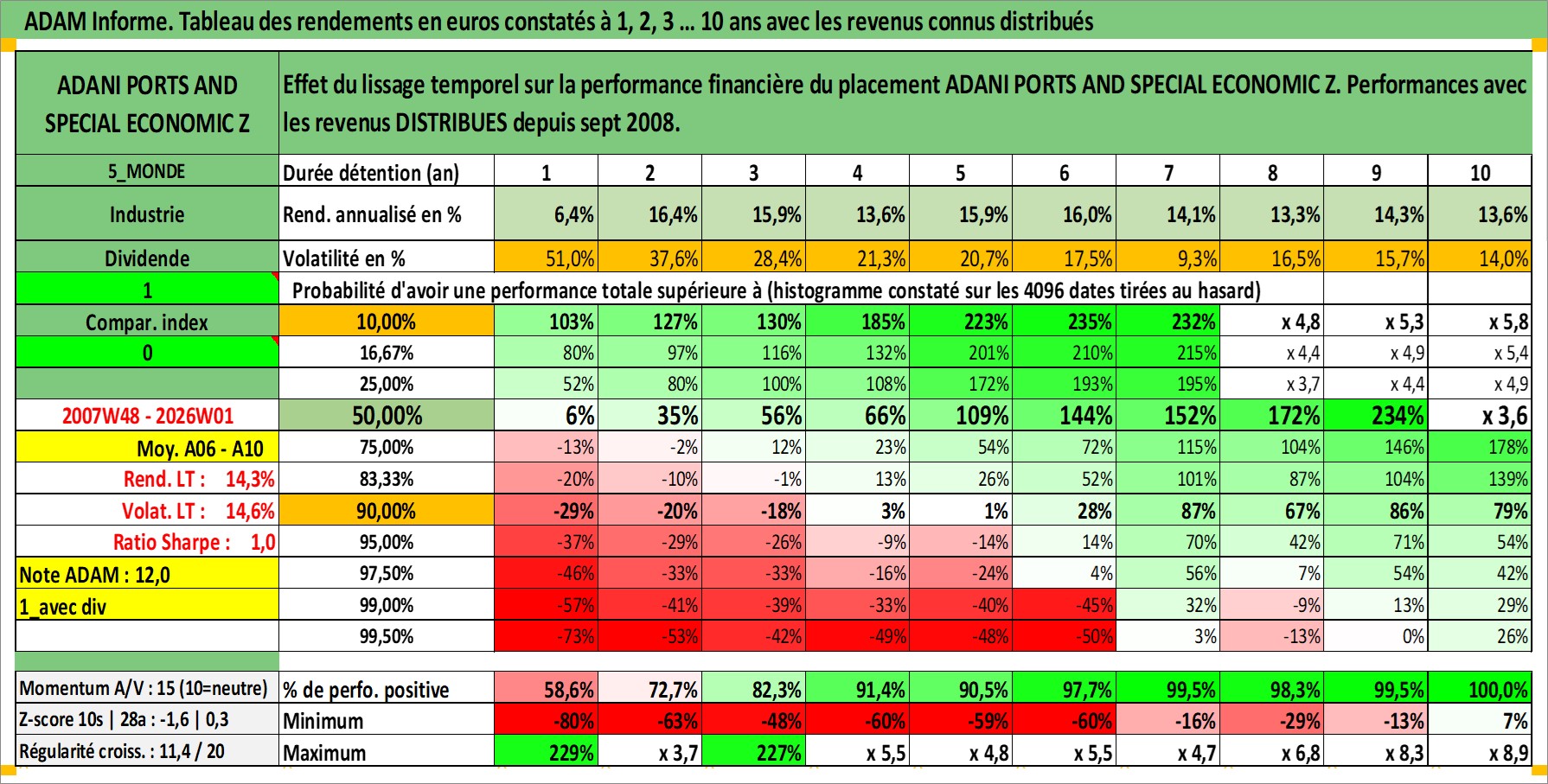 Site dédié aux investisseursPage dédiée sur site financeAnalyse des valorisations hebdomadaires de l'action ADANI PORTS AND SPECIAL ECONOMIC Z. Cet actif est cote en INR. Les valorisations sont en contrevaleur EURO et couvrent les semaines 2007W48 a 2026W01. Les revenus de cet actif financier sont pris en compte depuis la semaine 2008W37. La note globale ESG de cet actif est estimee a 15.0 (apres rebasage entre 0 et 20).