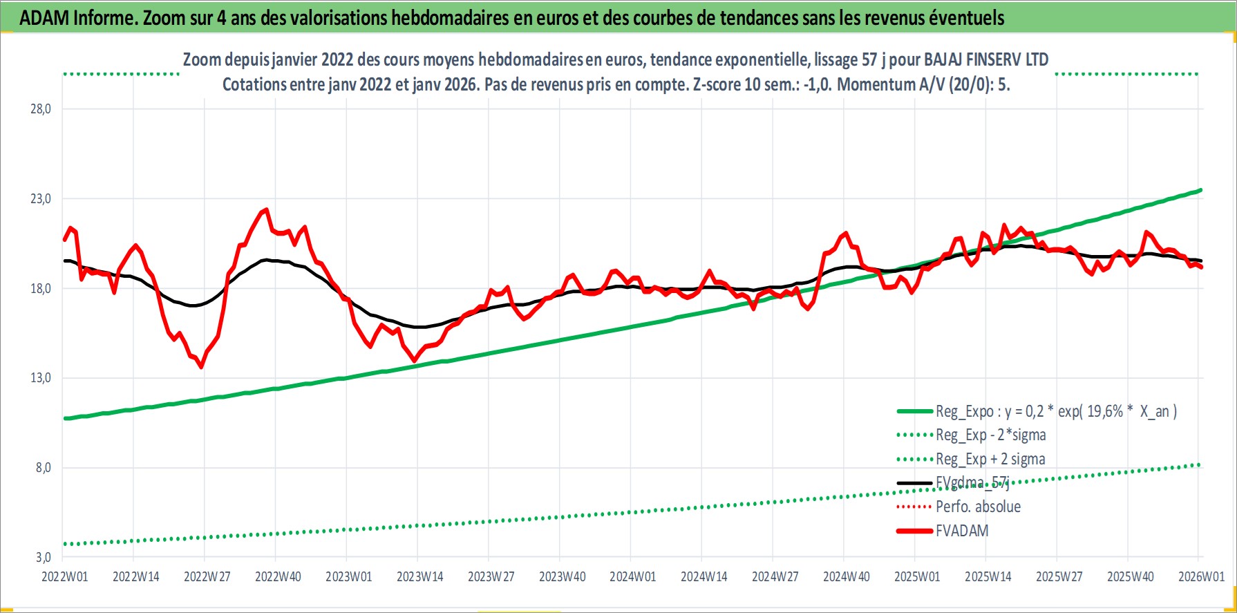 Site dédié aux investisseursPage dédiée sur site financeAnalyse des valorisations hebdomadaires de l'action BAJAJ FINSERV LTD. Cet actif est cote en INR. Les valorisations sont en contrevaleur EURO et couvrent les semaines 2002W33 a 2026W01. Les revenus de cet actif financier sont pris en compte depuis la semaine 2008W26. La note globale ESG de cet actif est estimee a 7.0 (apres rebasage entre 0 et 20).