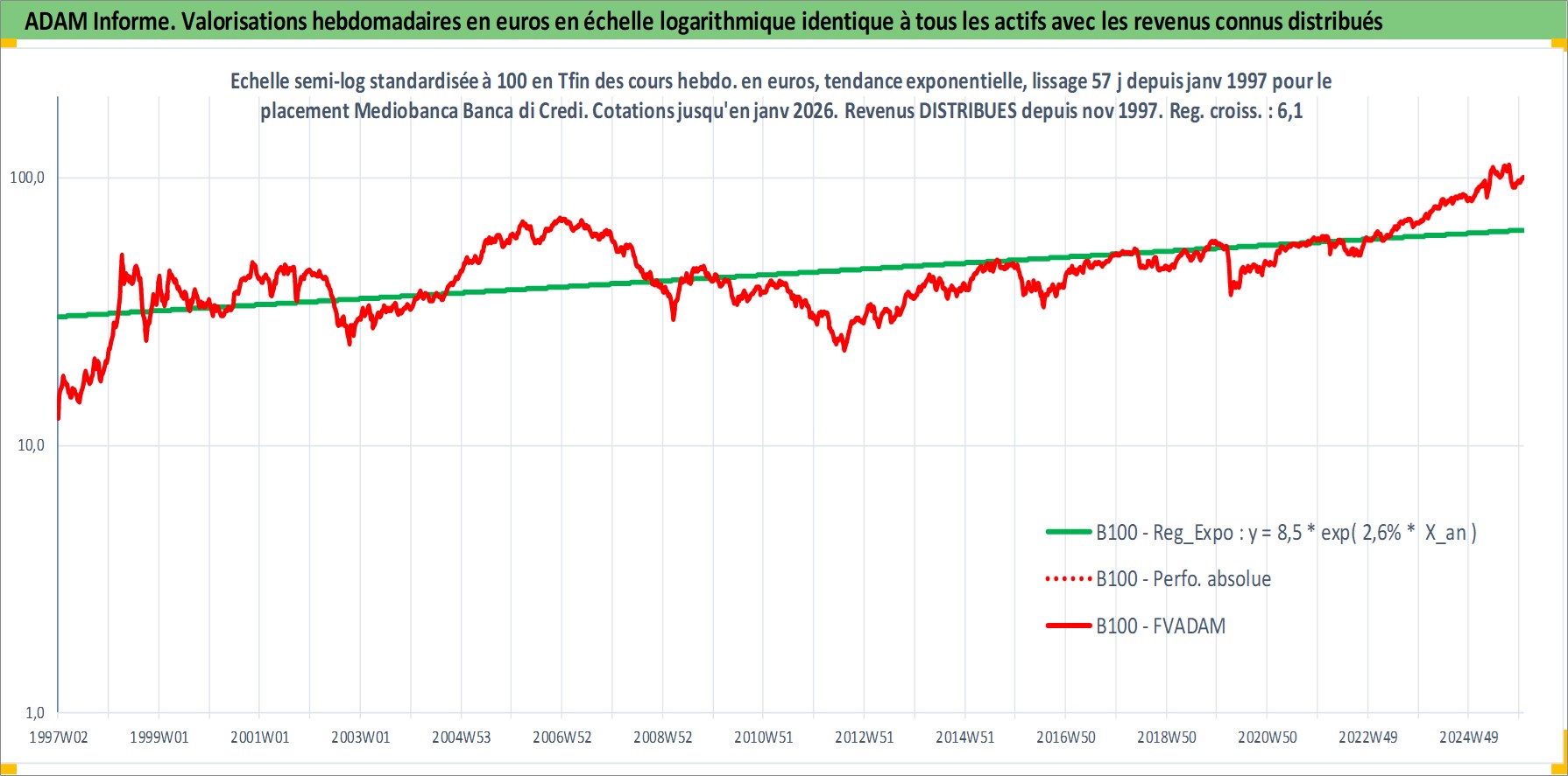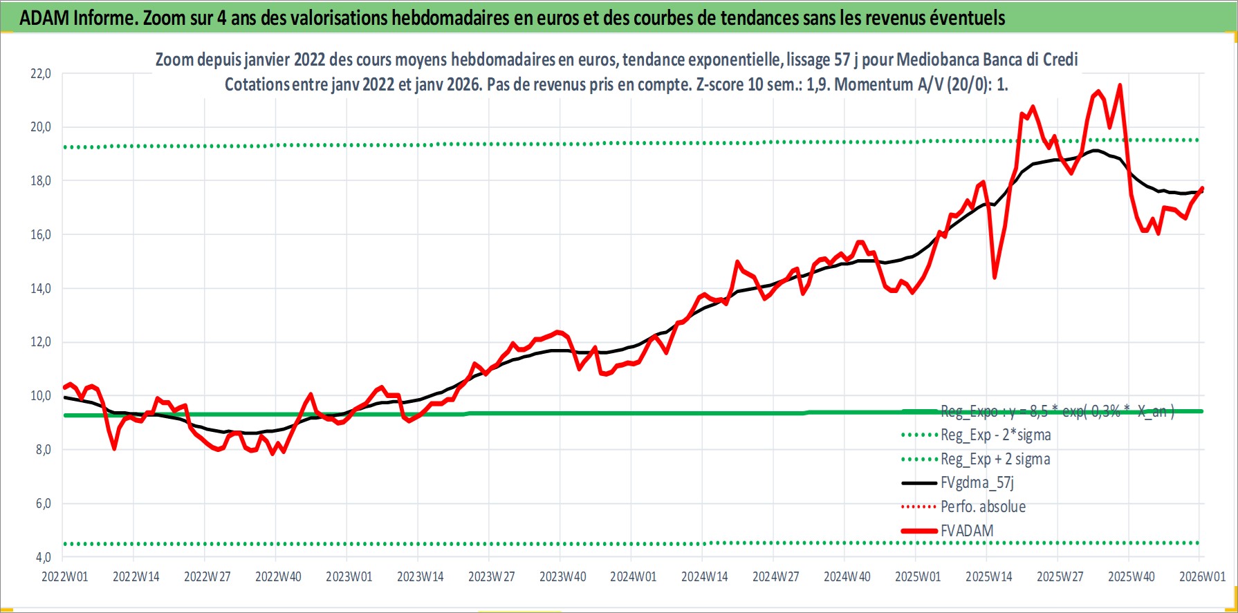 Site dédié aux investisseursPage dédiée sur site financeAnalyse des valorisations hebdomadaires de l'action Mediobanca Banca di Credito Finanziario. Cet actif est cote en EUR. Les valorisations couvrent les semaines 1997W01 a 2026W01. Les revenus de cet actif financier sont pris en compte depuis la semaine 1997W48. La note globale ESG de cet actif est estimee a 14.0 (apres rebasage entre 0 et 20).