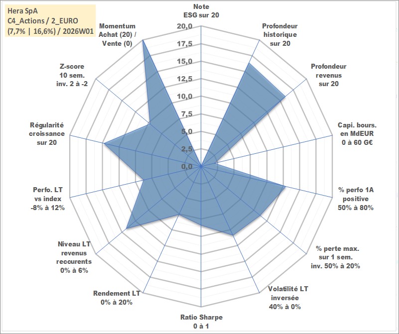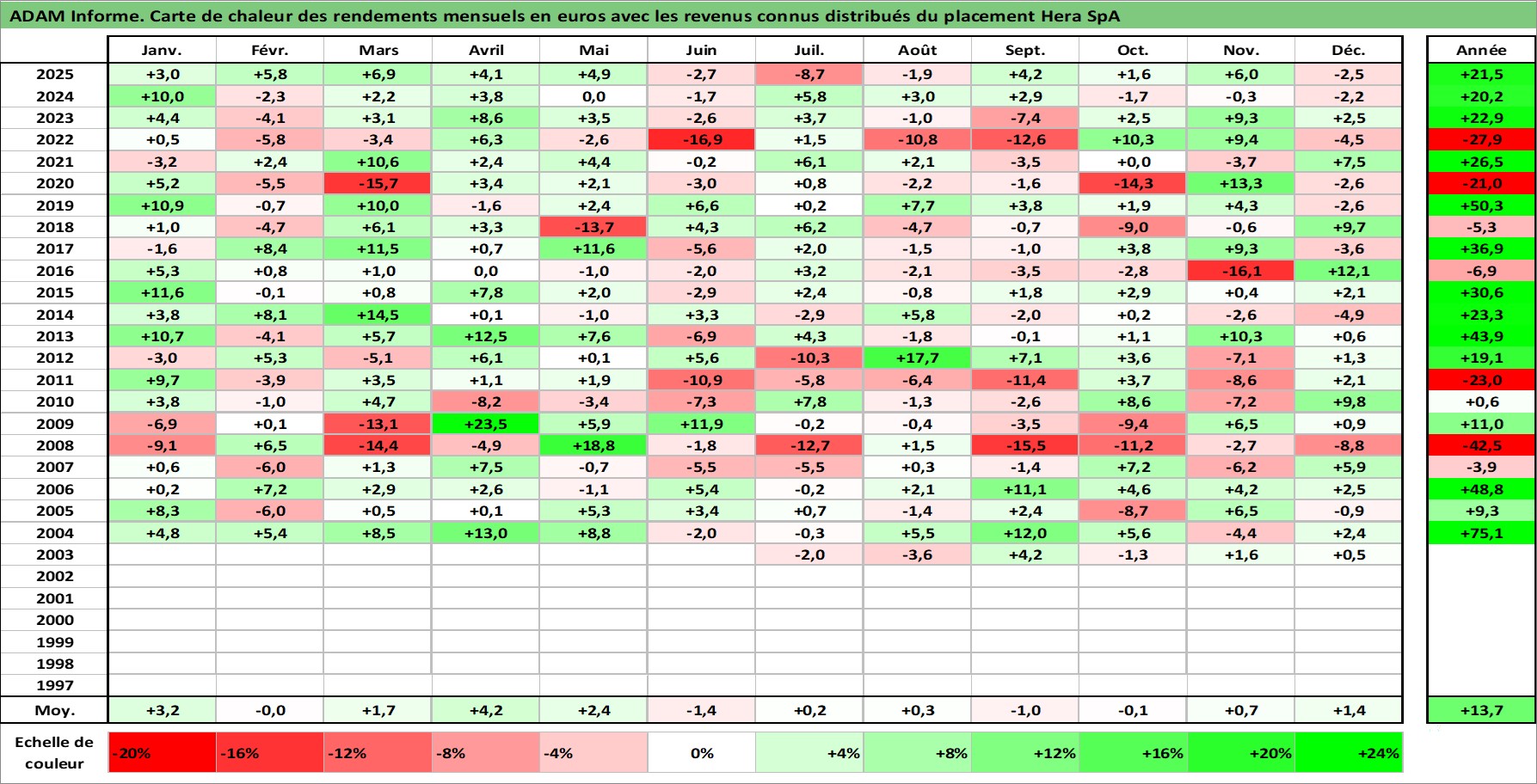 Site dédié aux investisseursPage dédiée sur site financeAnalyse des valorisations hebdomadaires de l'action Hera SpA. Cet actif est cote en EUR. Les valorisations couvrent les semaines 2003W26 a 2026W01. Les revenus de cet actif financier sont pris en compte depuis la semaine 2004W23. La note ESG de cet actif n'est pas connue.