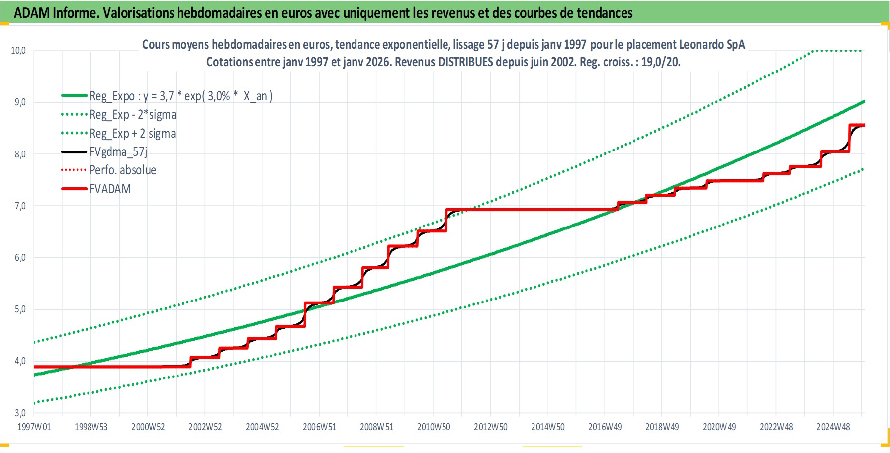 Site dédié aux investisseursPage dédiée sur site financeAnalyse des valorisations hebdomadaires de l'action Leonardo SpA. Cet actif est cote en EUR. Les valorisations couvrent les semaines 1997W01 a 2026W01. Les revenus de cet actif financier sont pris en compte depuis la semaine 2002W26. La note globale ESG de cet actif est estimee a 10.0 (apres rebasage entre 0 et 20).