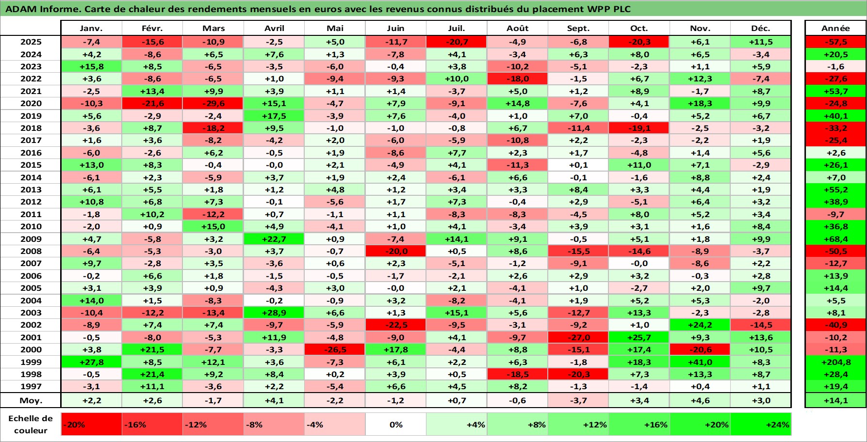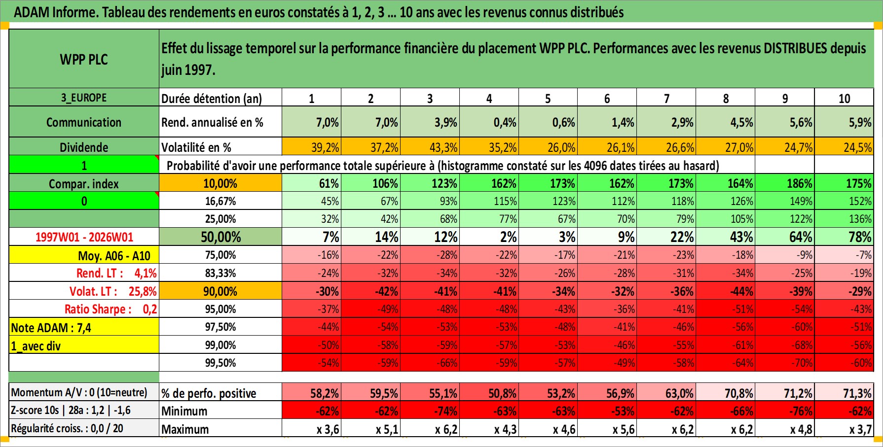 Site dédié aux investisseursPage dédiée sur site financeAnalyse des valorisations hebdomadaires de l'action WPP PLC. Cet actif est cote en GBX. Les valorisations sont en contrevaleur EURO et couvrent les semaines 1997W01 a 2026W01. Les revenus de cet actif financier sont pris en compte depuis la semaine 1997W24. La note globale ESG de cet actif est estimee a 15.0 (apres rebasage entre 0 et 20).