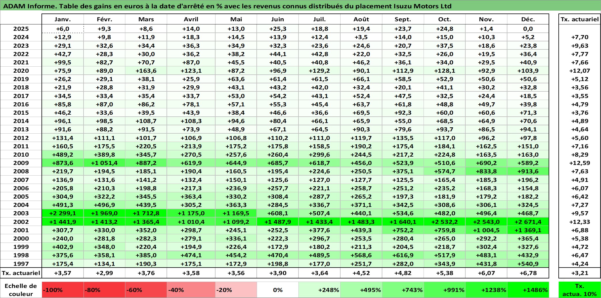 Site dédié aux investisseursPage dédiée sur site financeAnalyse des valorisations hebdomadaires de l'action Isuzu Motors Ltd. Cet actif est cote en JPY. Les valorisations sont en contrevaleur EURO et couvrent les semaines 1997W01 a 2026W01. Les revenus de cet actif financier sont pris en compte depuis la semaine 1997W13. La note globale ESG de cet actif est estimee a 7.0 (apres rebasage entre 0 et 20).