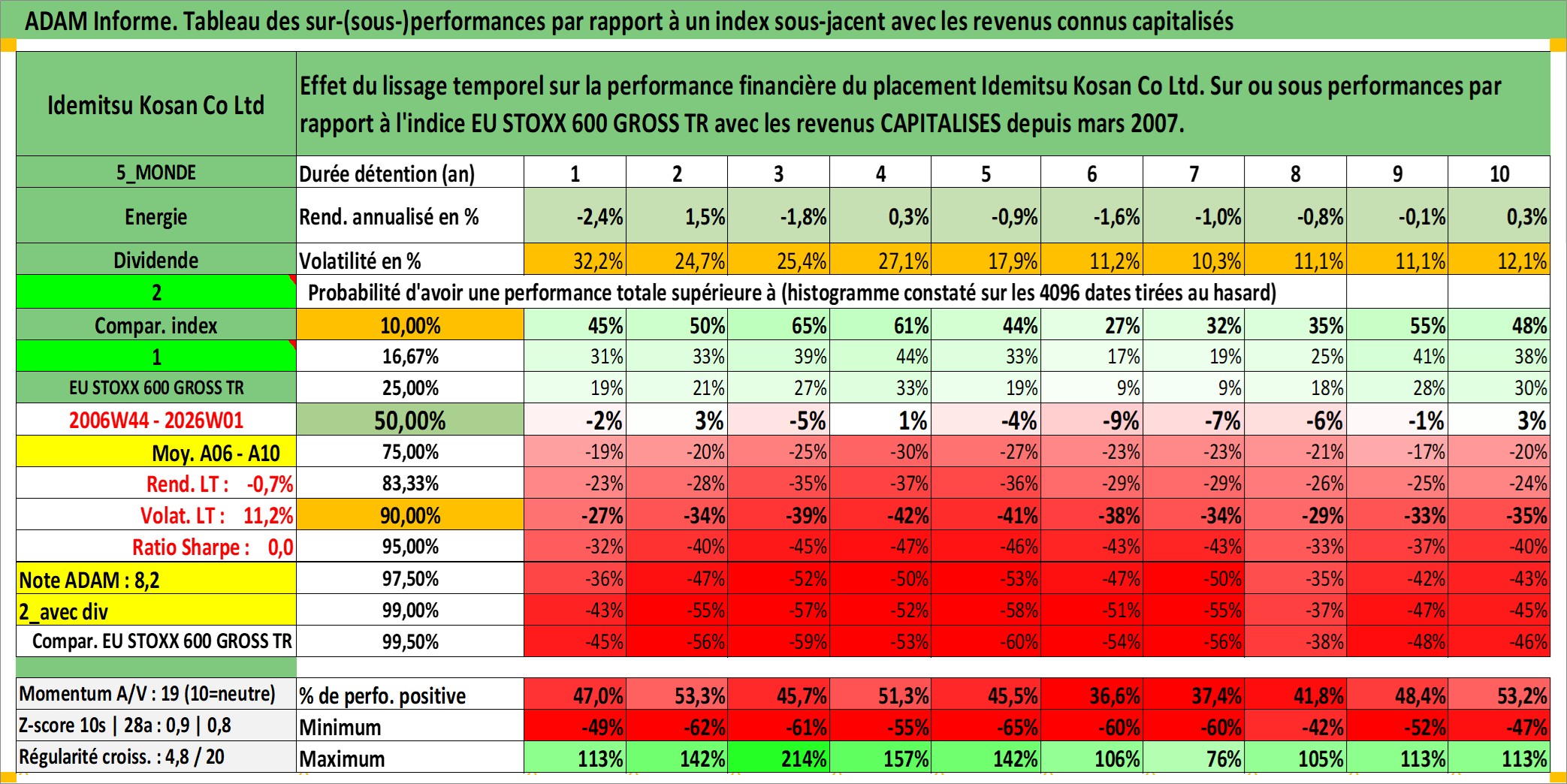 Site dédié aux investisseursPage dédiée sur site financeAnalyse des valorisations hebdomadaires de l'action Idemitsu Kosan Co Ltd. Cet actif est cote en JPY. Les valorisations sont en contrevaleur EURO et couvrent les semaines 2006W44 a 2026W01. Les revenus de cet actif financier sont pris en compte depuis la semaine 2007W13. La note ESG de cet actif n'est pas connue.