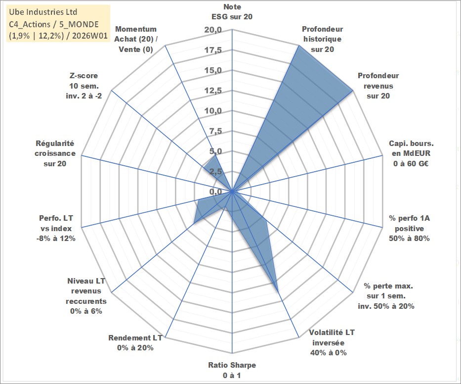 Site dédié aux investisseursPage dédiée sur site financeAnalyse des valorisations hebdomadaires de l'action Ube Industries Ltd. Cet actif est cote en JPY. Les valorisations sont en contrevaleur EURO et couvrent les semaines 1997W01 a 2026W01. Les revenus de cet actif financier sont pris en compte depuis la semaine 1997W13. La note ESG de cet actif n'est pas connue.
