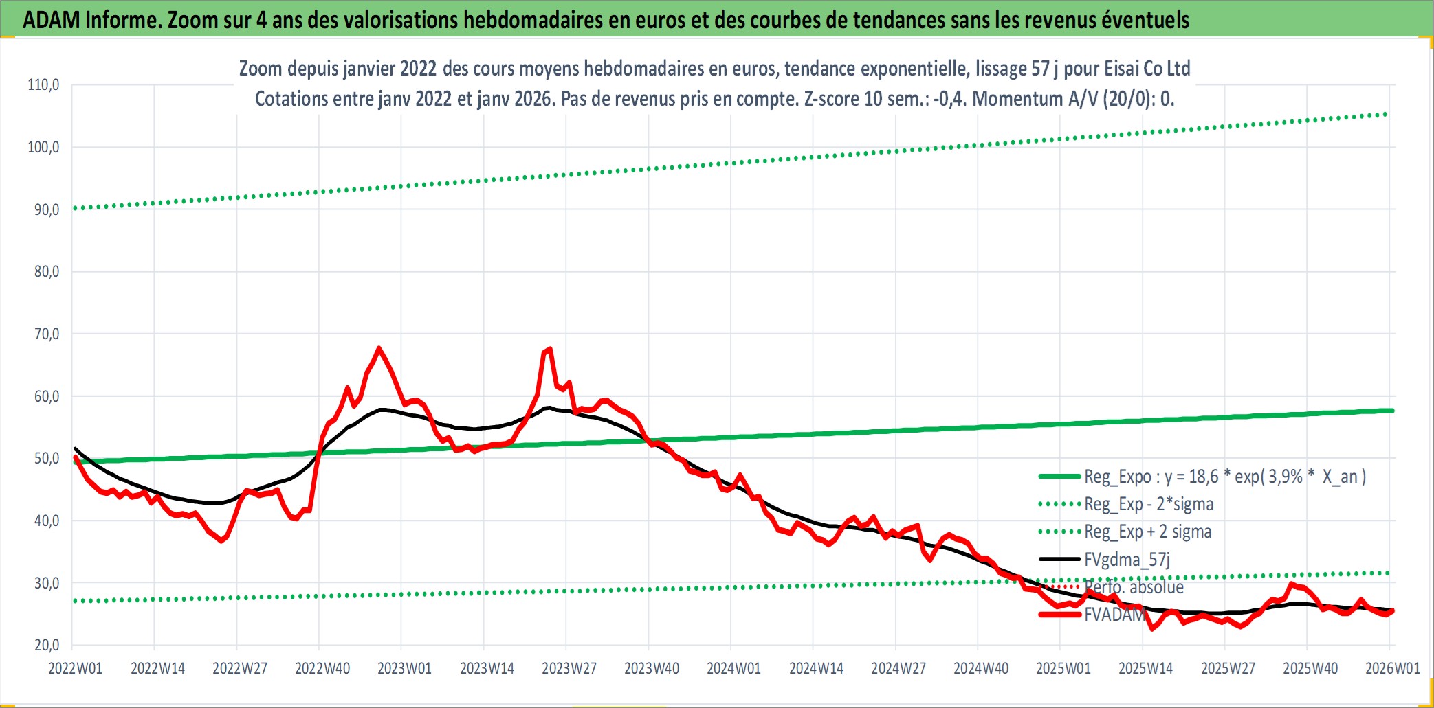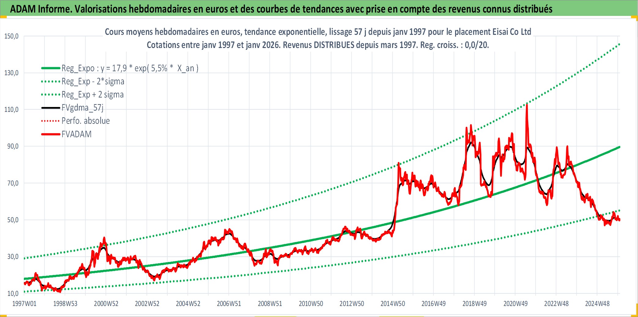 Site dédié aux investisseursPage dédiée sur site financeAnalyse des valorisations hebdomadaires de l'action Eisai Co Ltd. Cet actif est cote en JPY. Les valorisations sont en contrevaleur EURO et couvrent les semaines 1997W01 a 2026W01. Les revenus de cet actif financier sont pris en compte depuis la semaine 1997W13. La note globale ESG de cet actif est estimee a 7.0 (apres rebasage entre 0 et 20).