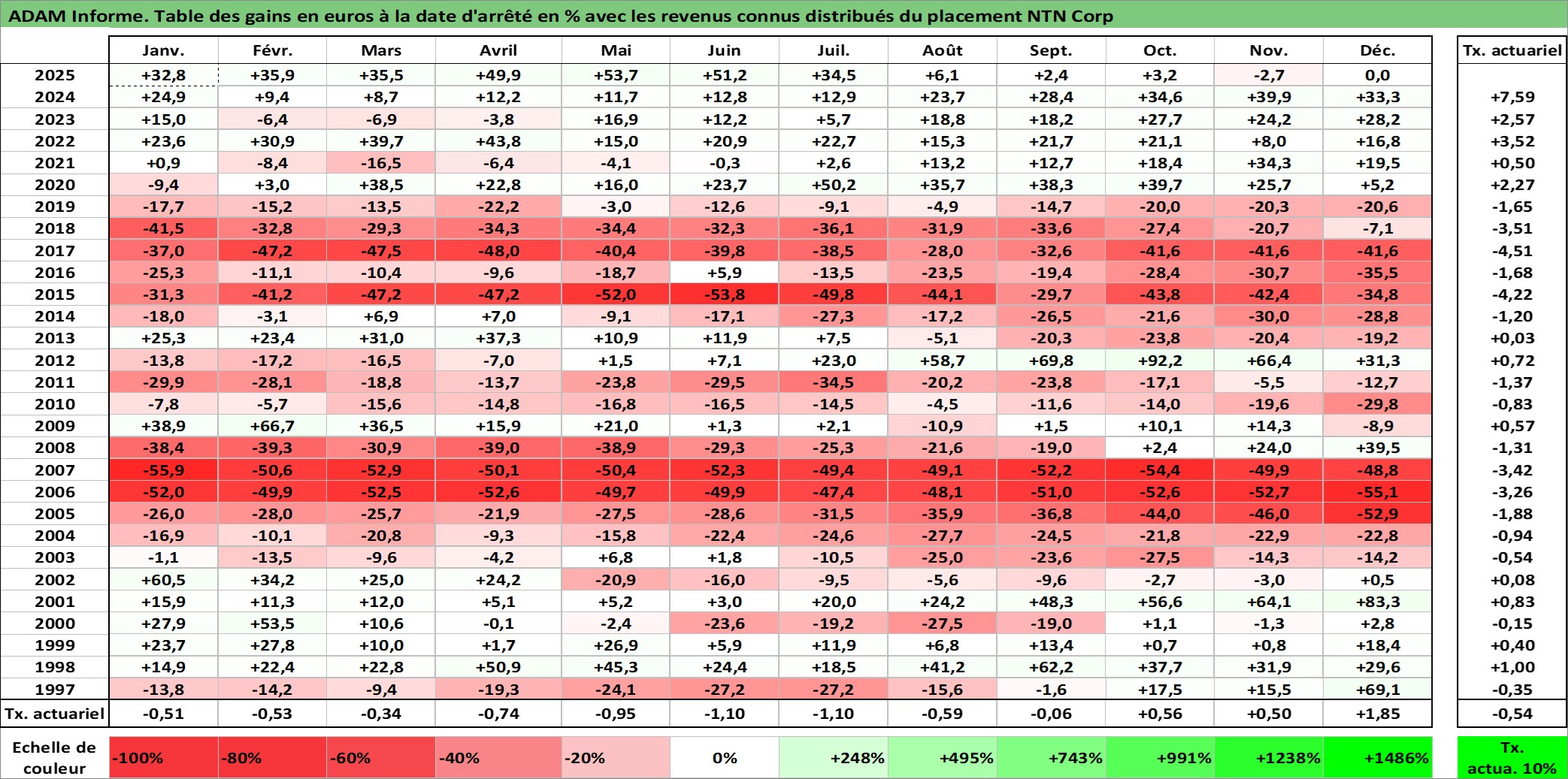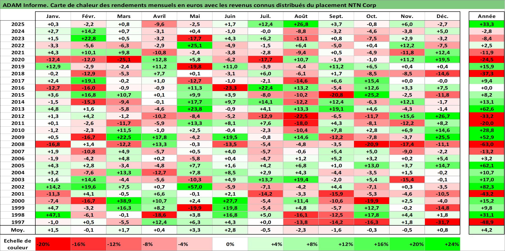 Site dédié aux investisseursPage dédiée sur site financeAnalyse des valorisations hebdomadaires de l'action NTN Corp. Cet actif est cote en JPY. Les valorisations sont en contrevaleur EURO et couvrent les semaines 1997W01 a 2026W01. Les revenus de cet actif financier sont pris en compte depuis la semaine 1997W13. La note ESG de cet actif n'est pas connue.