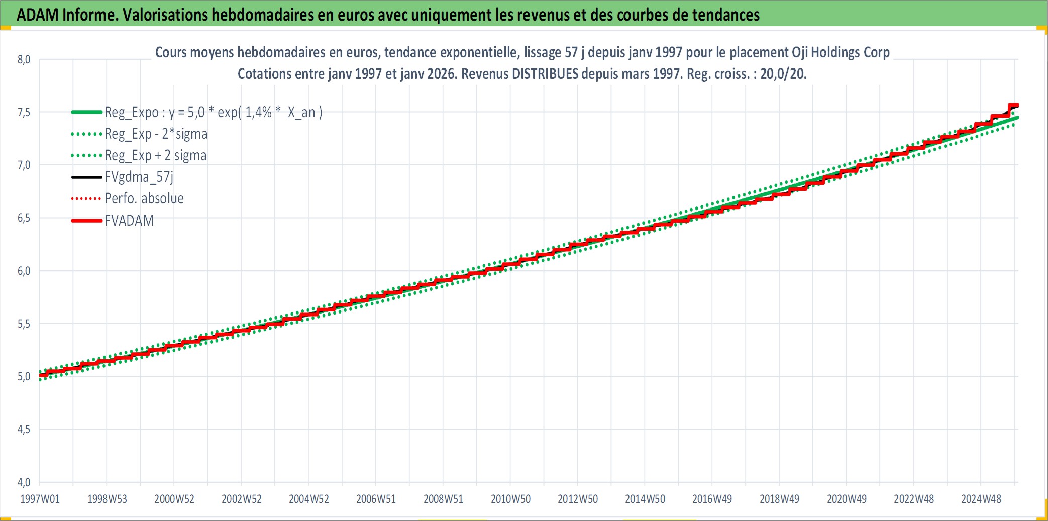 Site dédié aux investisseursPage dédiée sur site financeAnalyse des valorisations hebdomadaires de l'action Oji Holdings Corp. Cet actif est cote en JPY. Les valorisations sont en contrevaleur EURO et couvrent les semaines 1997W01 a 2026W01. Les revenus de cet actif financier sont pris en compte depuis la semaine 1997W13. La note ESG de cet actif n'est pas connue.