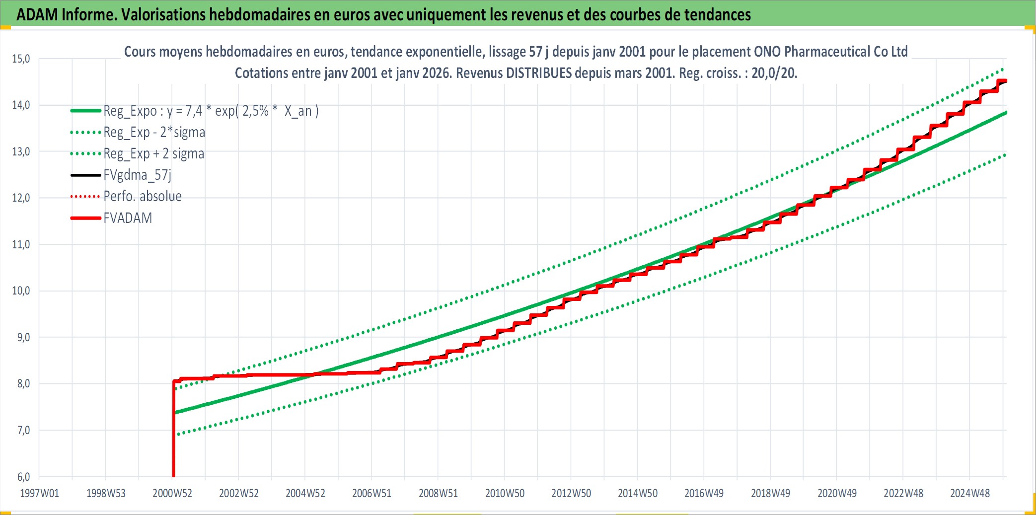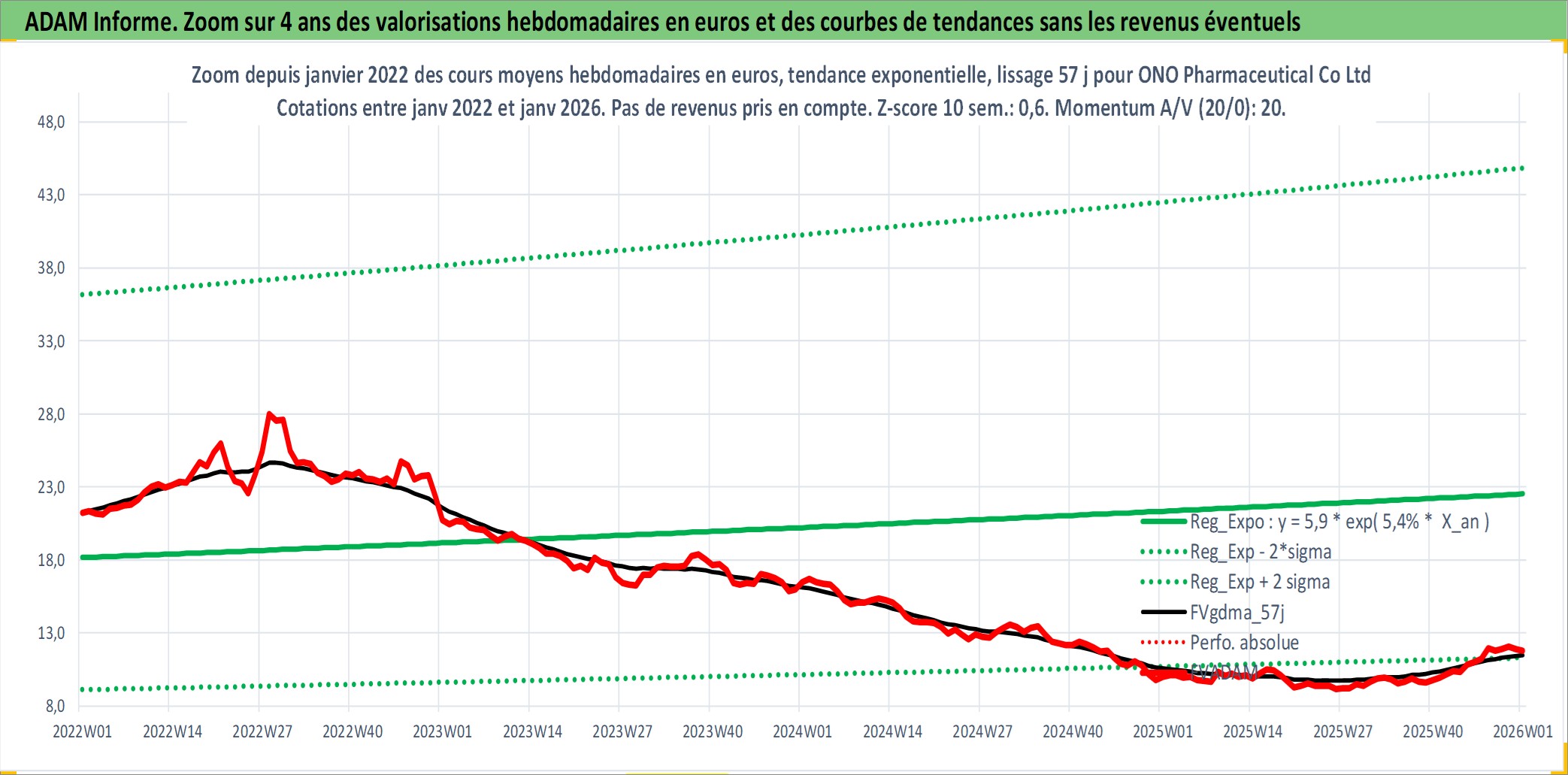 Site dédié aux investisseursPage dédiée sur site financeAnalyse des valorisations hebdomadaires de l'action ONO Pharmaceutical Co Ltd. Cet actif est cote en JPY. Les valorisations sont en contrevaleur EURO et couvrent les semaines 2001W02 a 2026W01. Les revenus de cet actif financier sont pris en compte depuis la semaine 2001W13. La note globale ESG de cet actif est estimee a 7.0 (apres rebasage entre 0 et 20).