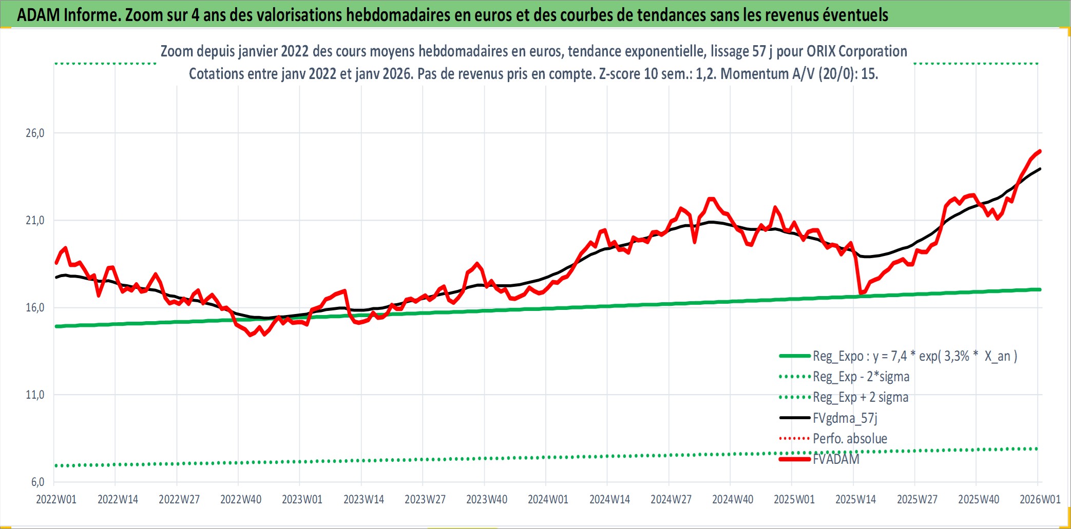 Site dédié aux investisseursPage dédiée sur site financeAnalyse des valorisations hebdomadaires de l'action ORIX Corporation. Cet actif est cote en JPY. Les valorisations sont en contrevaleur EURO et couvrent les semaines 2001W02 a 2026W01. Les revenus de cet actif financier sont pris en compte depuis la semaine 2001W13. La note globale ESG de cet actif est estimee a 10.0 (apres rebasage entre 0 et 20).