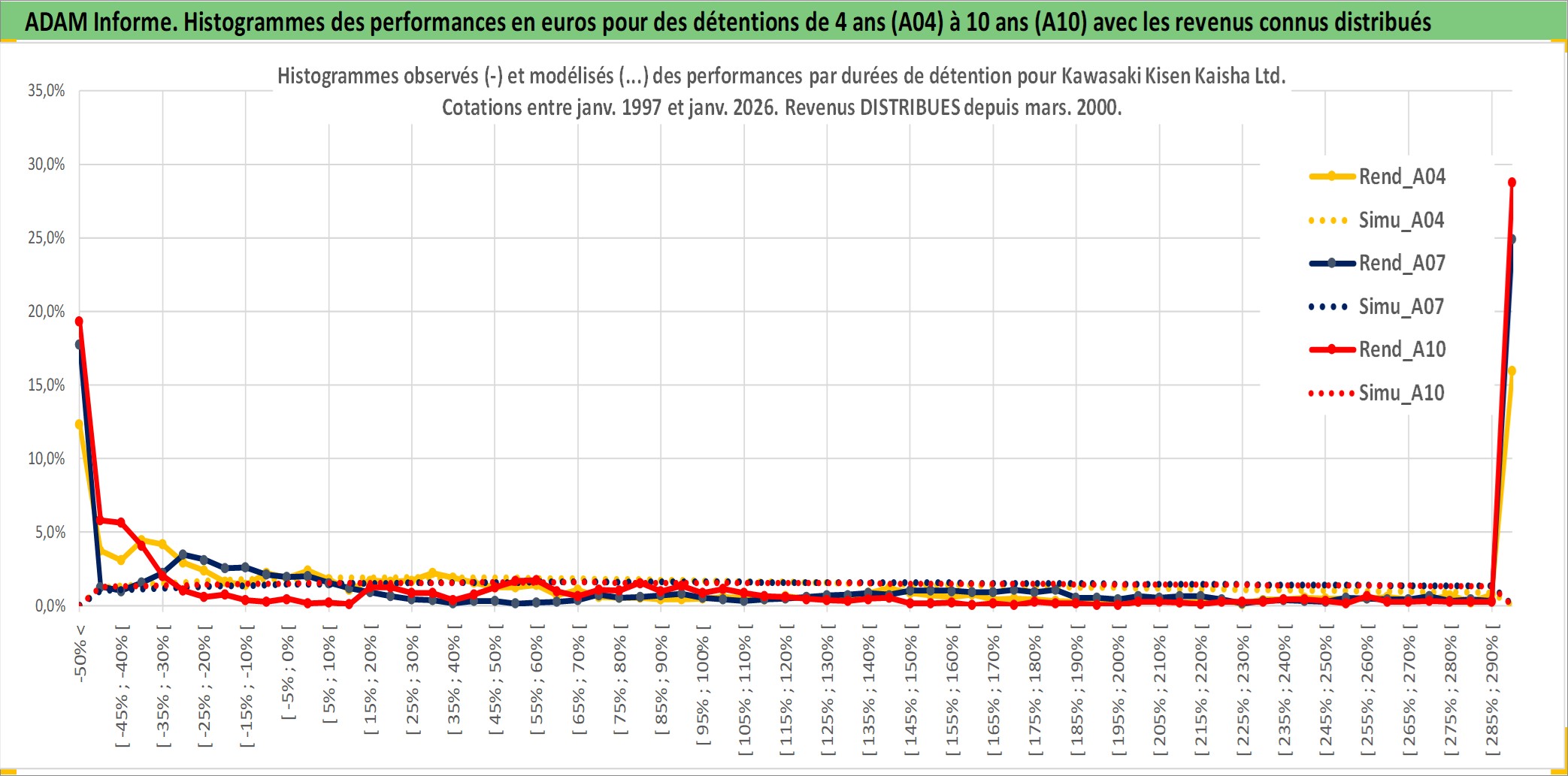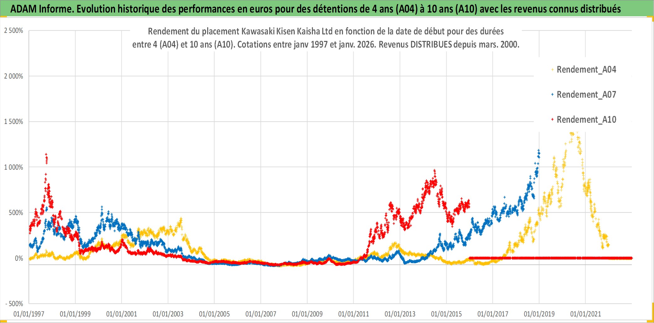 Site dédié aux investisseursPage dédiée sur site financeAnalyse des valorisations hebdomadaires de l'action Kawasaki Kisen Kaisha Ltd. Cet actif est cote en JPY. Les valorisations sont en contrevaleur EURO et couvrent les semaines 1997W01 a 2026W01. Les revenus de cet actif financier sont pris en compte depuis la semaine 2000W13. La note ESG de cet actif n'est pas connue.