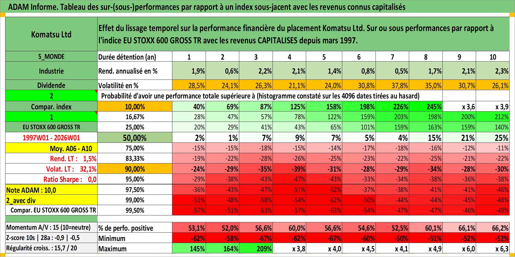 Site dédié aux investisseursPage dédiée sur site financeAnalyse des valorisations hebdomadaires de l'action Komatsu Ltd. Cet actif est cote en JPY. Les valorisations sont en contrevaleur EURO et couvrent les semaines 1997W01 a 2026W01. Les revenus de cet actif financier sont pris en compte depuis la semaine 1997W13. La note globale ESG de cet actif est estimee a 9.0 (apres rebasage entre 0 et 20).