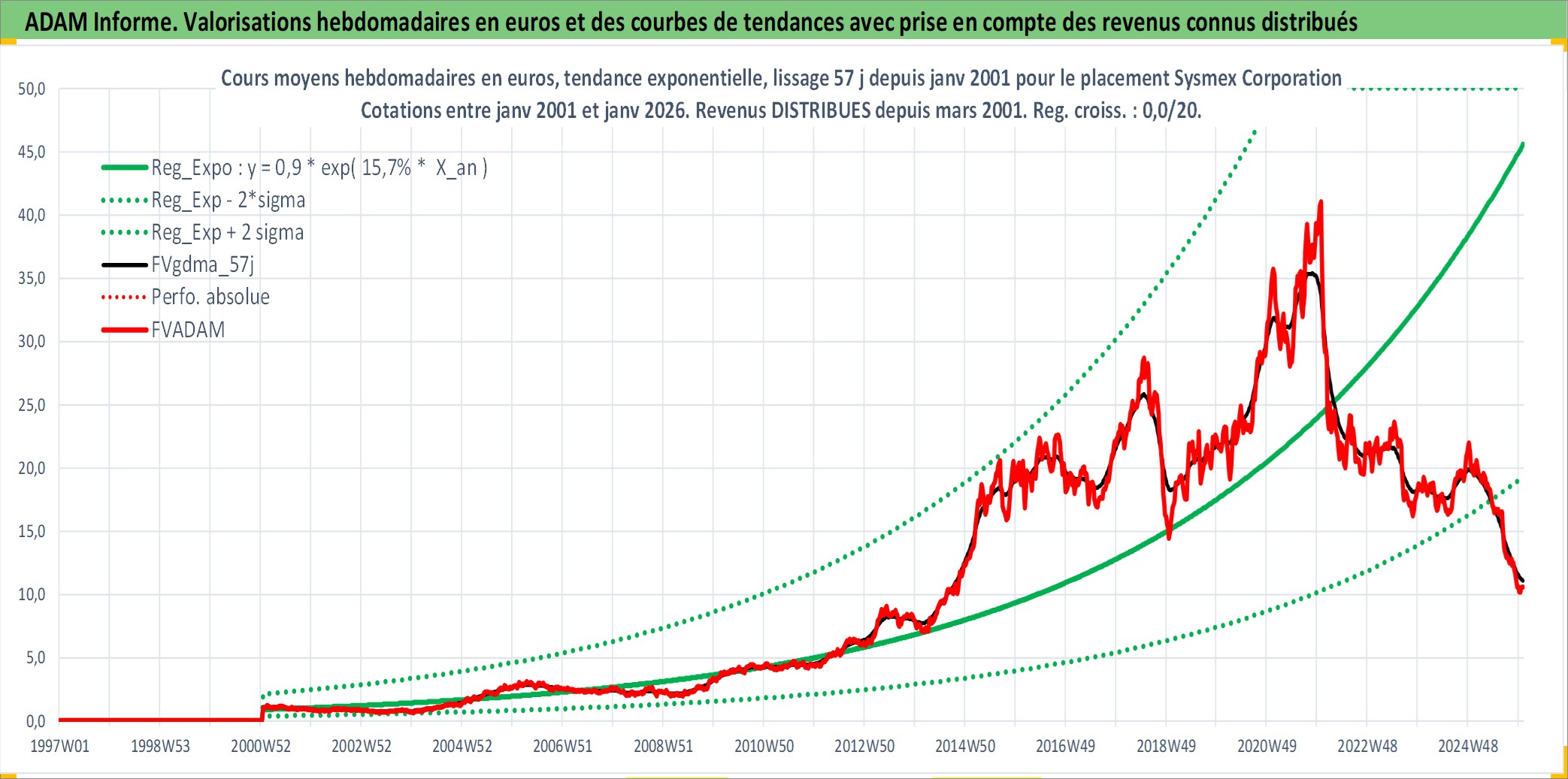 Site dédié aux investisseursPage dédiée sur site financeAnalyse des valorisations hebdomadaires de l'action Sysmex Corporation. Cet actif est cote en JPY. Les valorisations sont en contrevaleur EURO et couvrent les semaines 2001W02 a 2026W01. Les revenus de cet actif financier sont pris en compte depuis la semaine 2001W13. La note globale ESG de cet actif est estimee a 7.0 (apres rebasage entre 0 et 20).