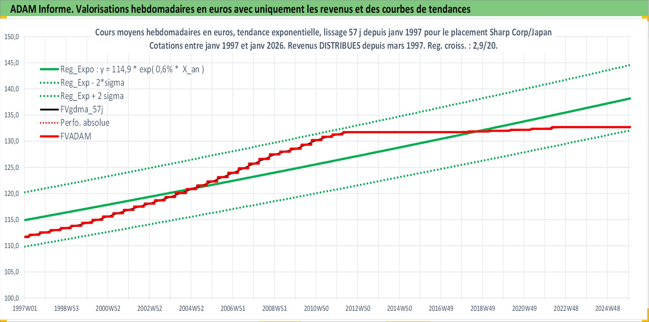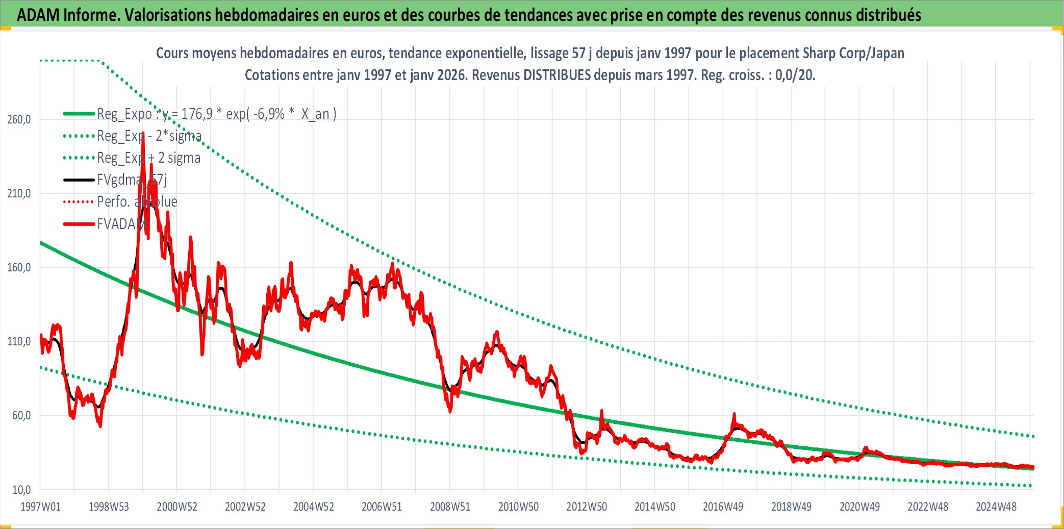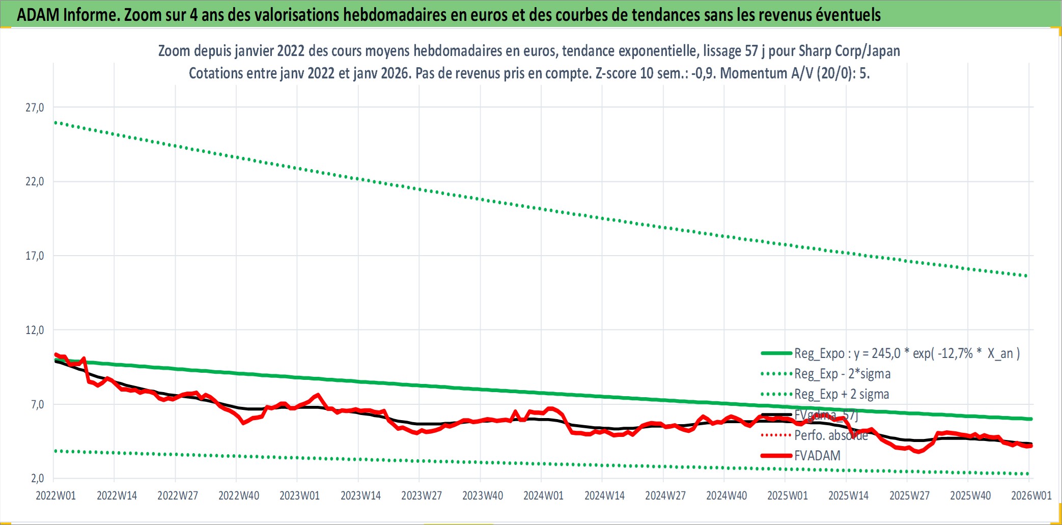 Site dédié aux investisseursPage dédiée sur site financeAnalyse des valorisations hebdomadaires de l'action Sharp Corp/Japan. Cet actif est cote en JPY. Les valorisations sont en contrevaleur EURO et couvrent les semaines 1997W01 a 2026W01. Les revenus de cet actif financier sont pris en compte depuis la semaine 1997W13. La note globale ESG de cet actif est estimee a 11.0 (apres rebasage entre 0 et 20).