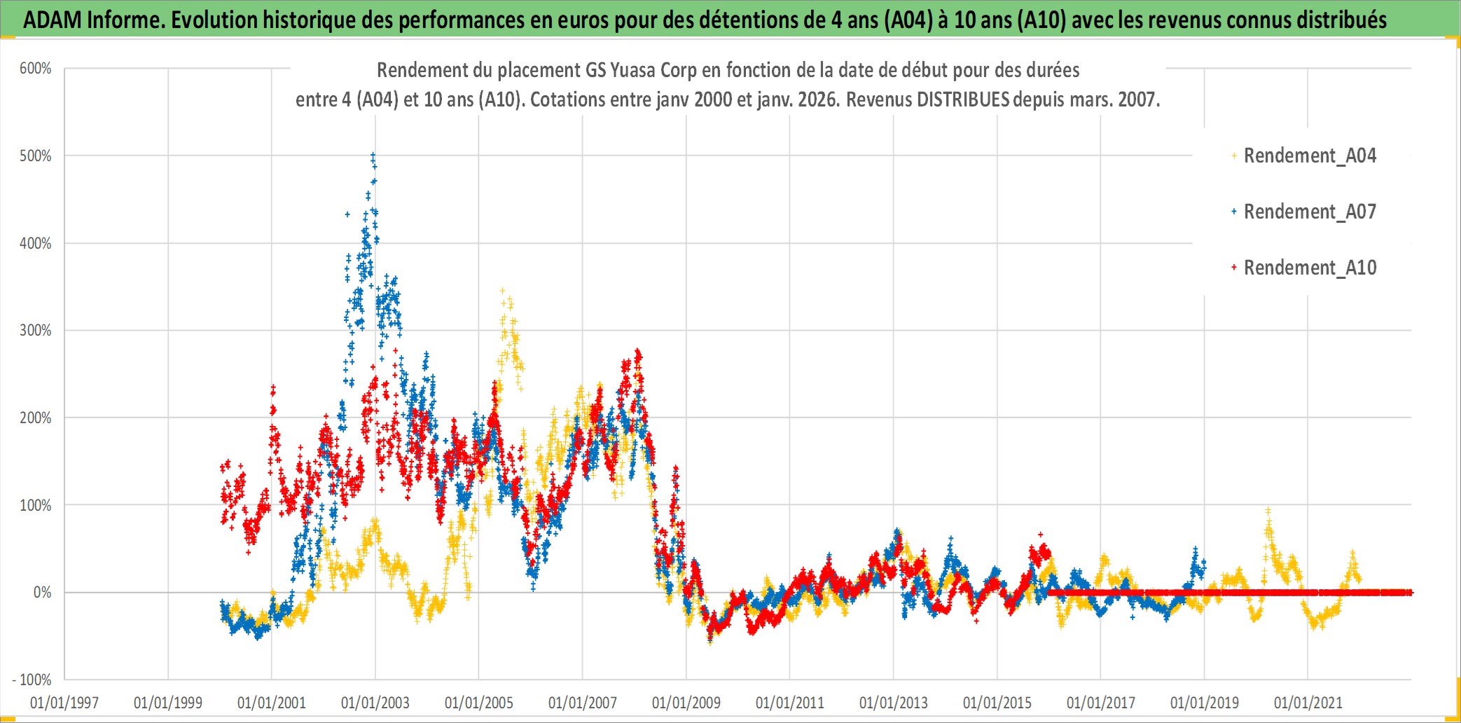 Site dédié aux investisseursPage dédiée sur site financeAnalyse des valorisations hebdomadaires de l'action GS Yuasa Corp. Cet actif est cote en JPY. Les valorisations sont en contrevaleur EURO et couvrent les semaines 2000W01 a 2026W01. Les revenus de cet actif financier sont pris en compte depuis la semaine 2007W13. La note ESG de cet actif n'est pas connue.